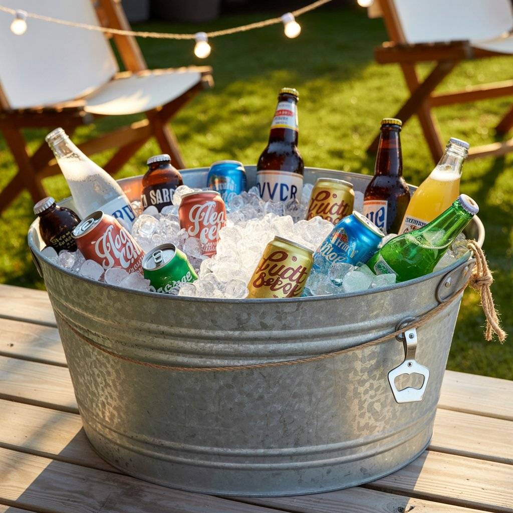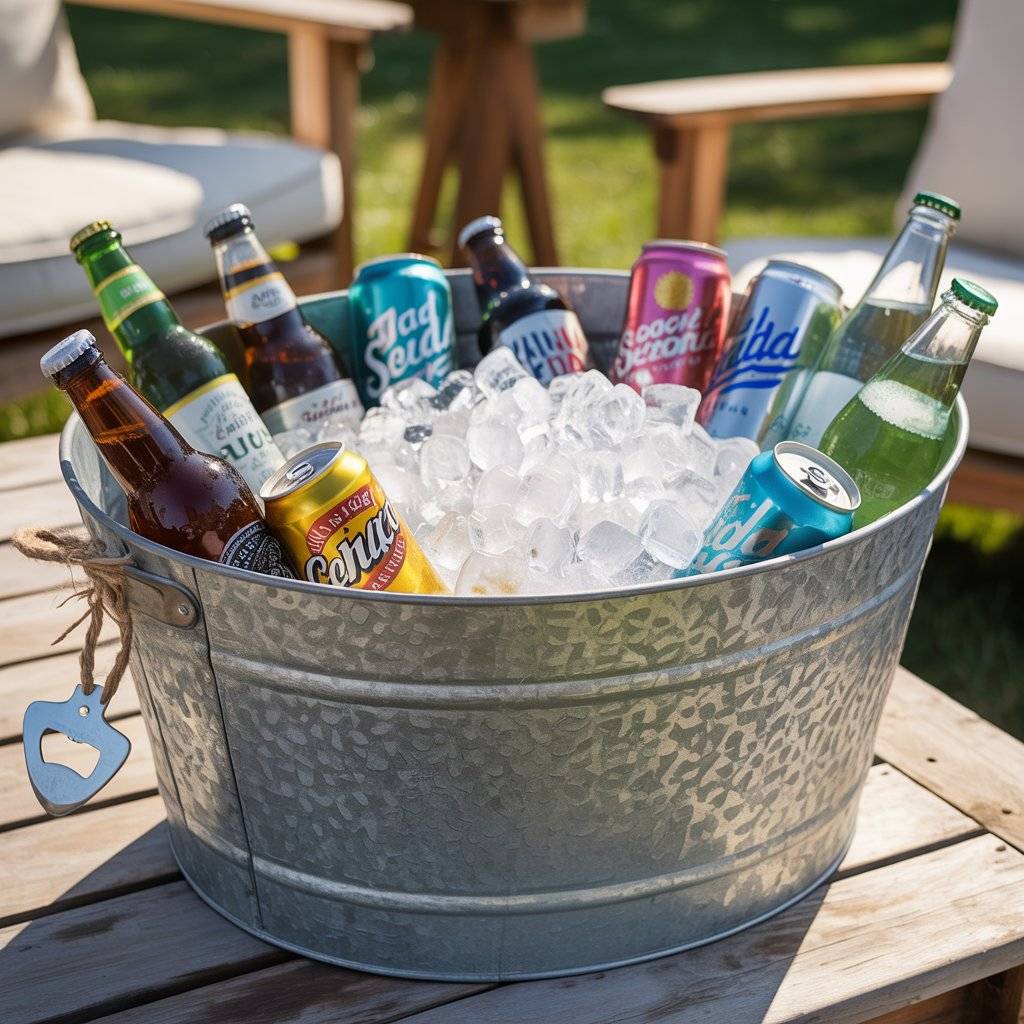 This simple setup keeps people from crowding the kitchen and lets them help themselves throughout the event. Add a bottle opener tied to the handle with twine so no one has to hunt for one. It’s a small detail, but it shows you’ve thought about making things easy for your guests.