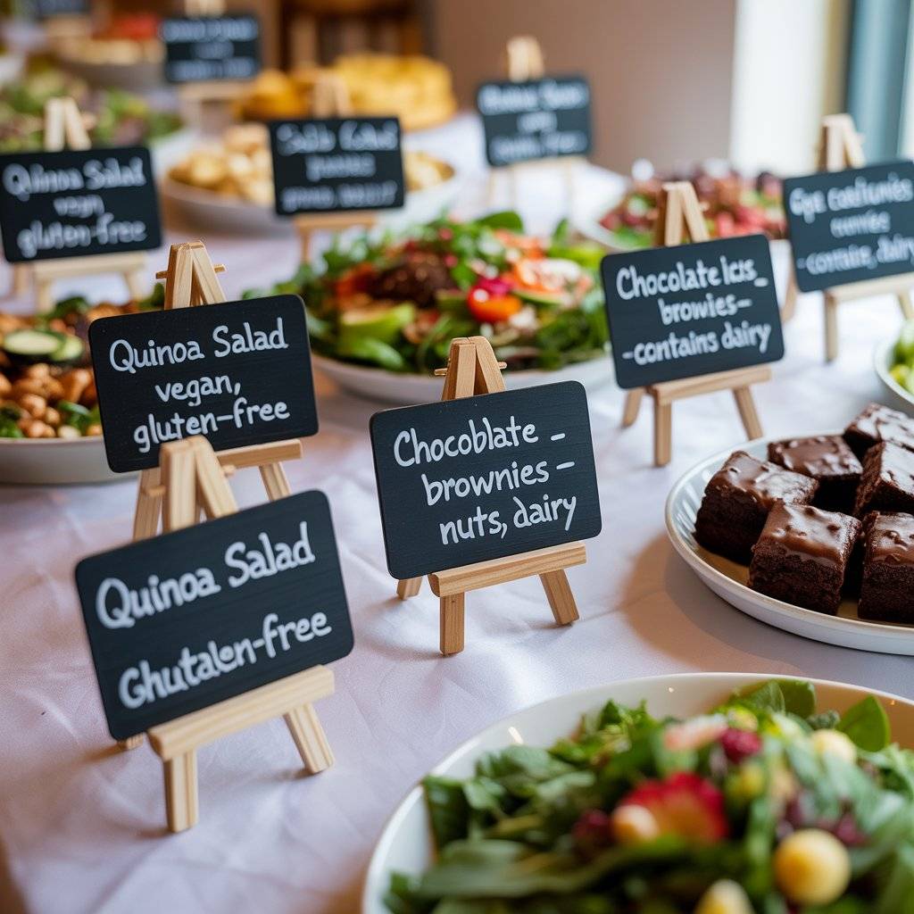 Food allergies and dietary restrictions are common, and your guests will appreciate knowing exactly what’s in each dish. Set up small chalkboard labels or simple tent cards next to each food item. Write the name of the dish and note if it contains common allergens like dairy, nuts, gluten, or if it’s vegetarian/vegan.