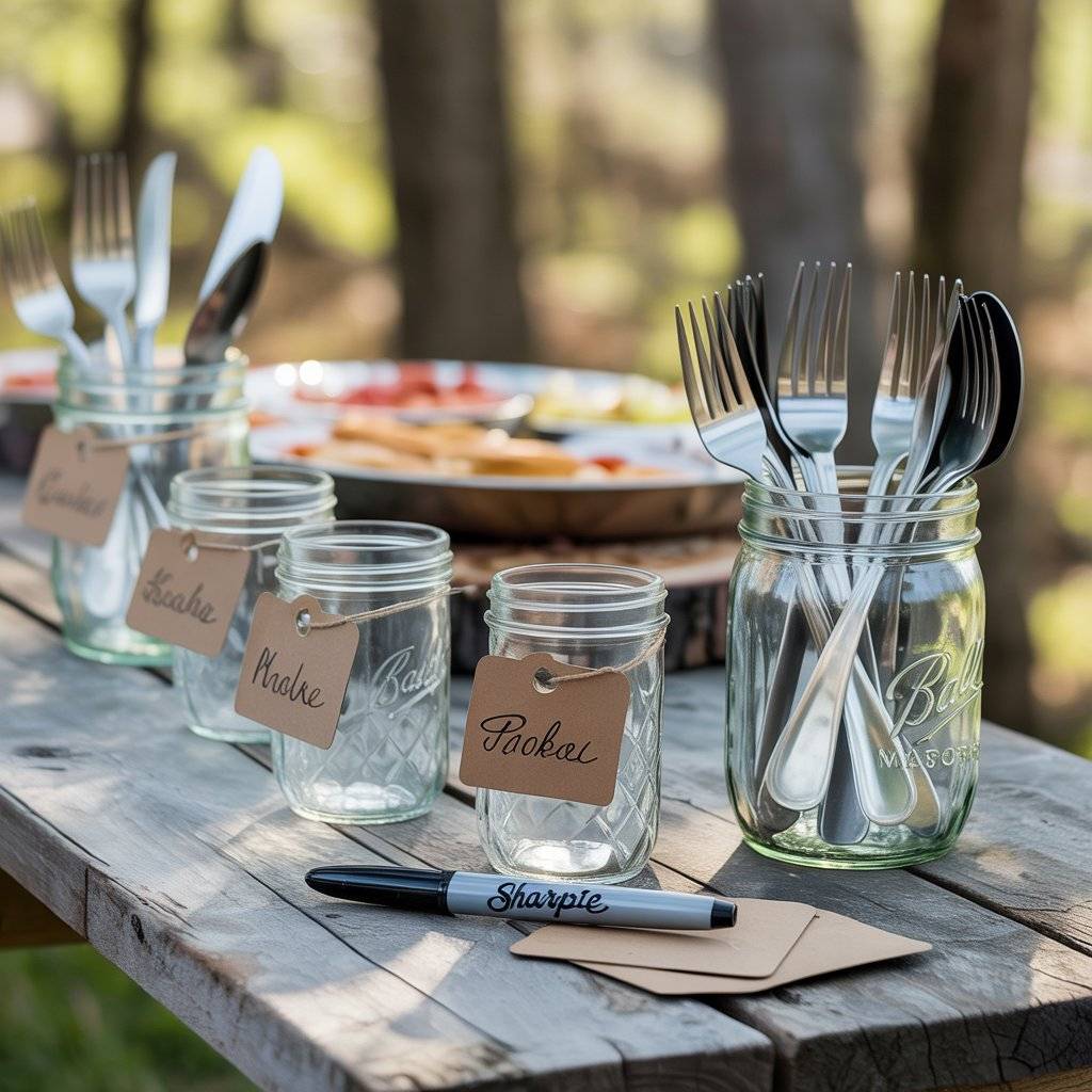 For utensils, fill a few jars with forks, knives, and spoons and place them at the ends of the food table. It keeps everything organized and fits the casual, rustic vibe of a spring BBQ. Plus, they’re easy to clean and reuse for future parties.