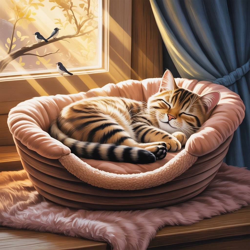 - A shy kitten settles in the high-sided bed near the window, watches birds, and plays gently later instead of bouncing off the furniture.