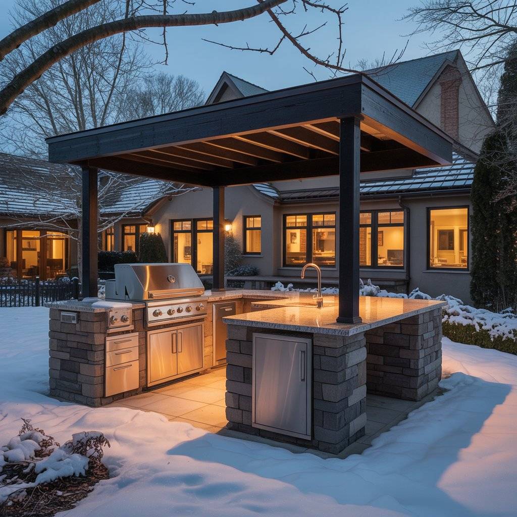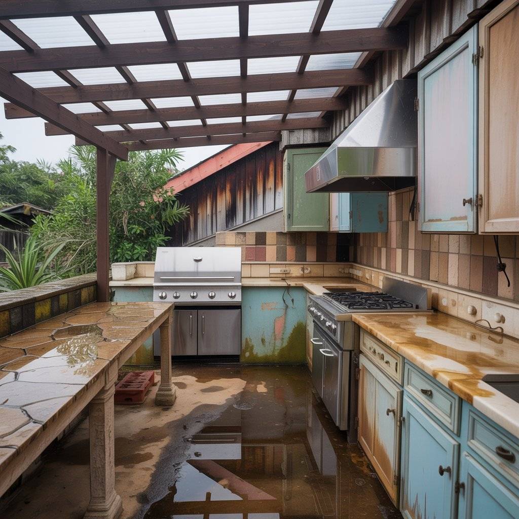 A simple solution is adding a roof or pergola above the kitchen area. This reduces direct exposure to weather and helps keep the space usable throughout the year.