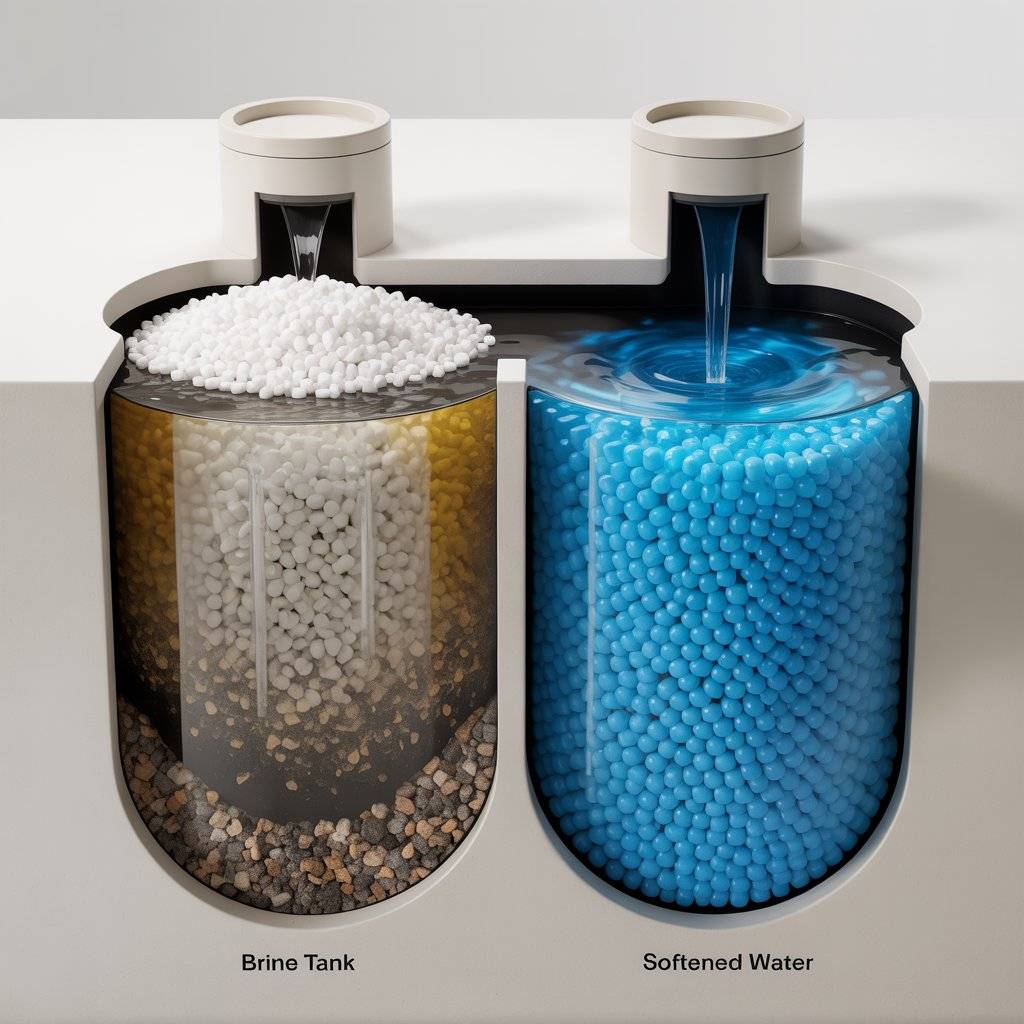 Water softeners come with two tanks. One of the tanks is a brine tank with salt, while the second contains polystyrene resin. The resin comprises plenty of beads, through which the water passes.