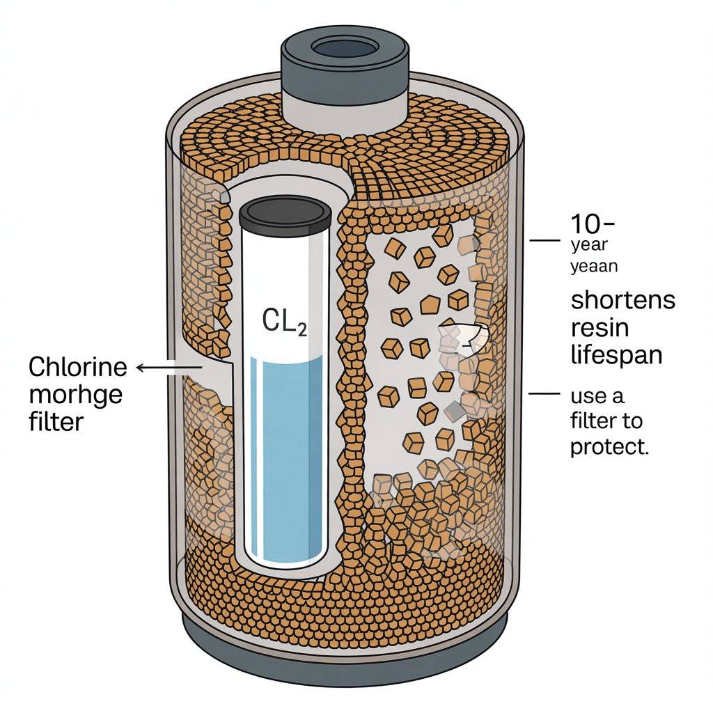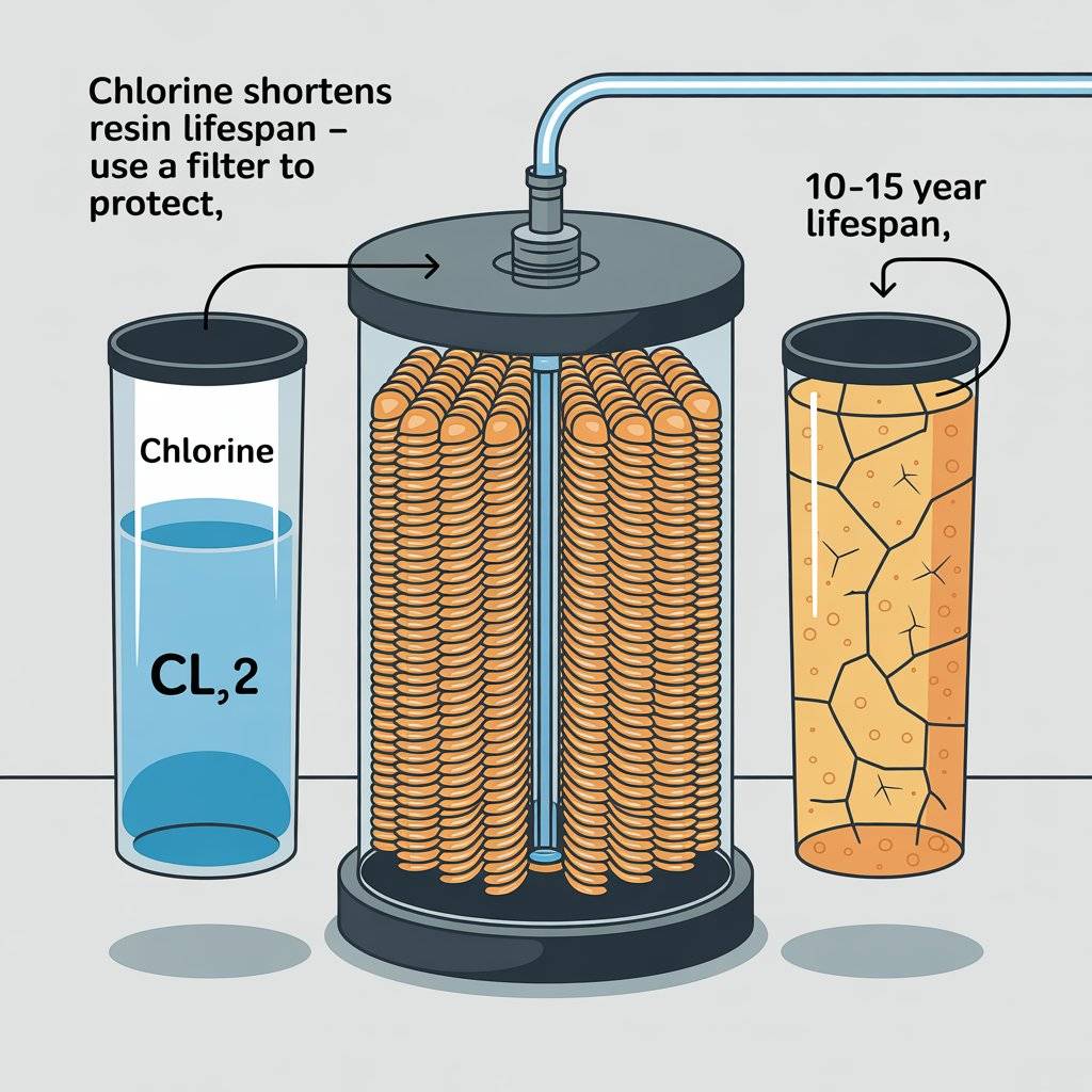 Contaminants such as chlorine, affect the lifespan of the resin. Therefore you need to install a filtration system to filter away the majority of chlorine before it reaches the softener.
