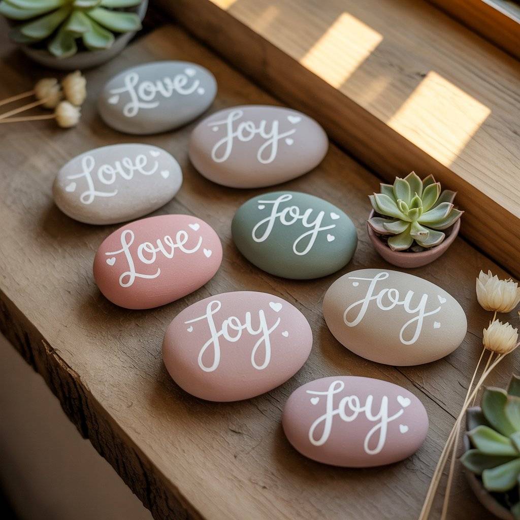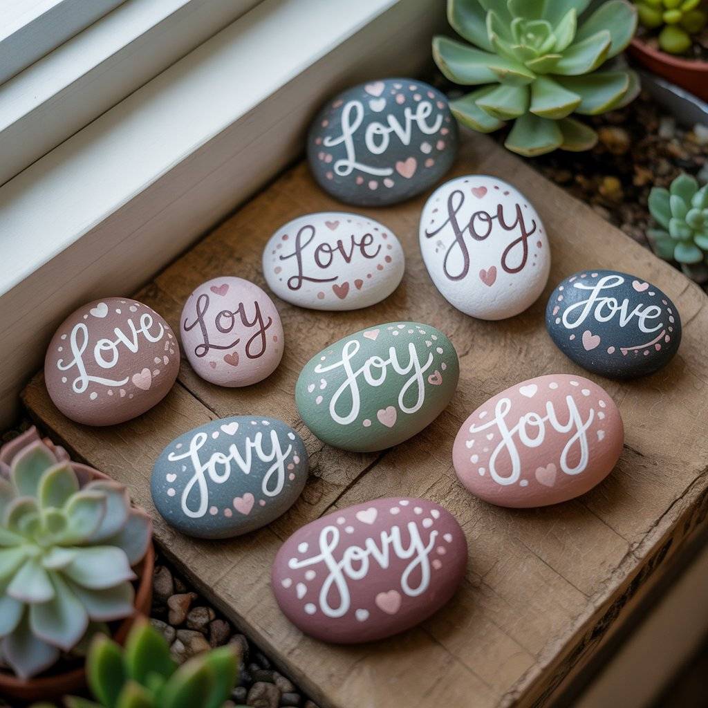 I painted small, smooth stones with tiny messages like “Love,” “Joy,” or initials. Sometimes I added small hearts or dots for decoration. These stones can be displayed on a desk, windowsill, or garden spot.