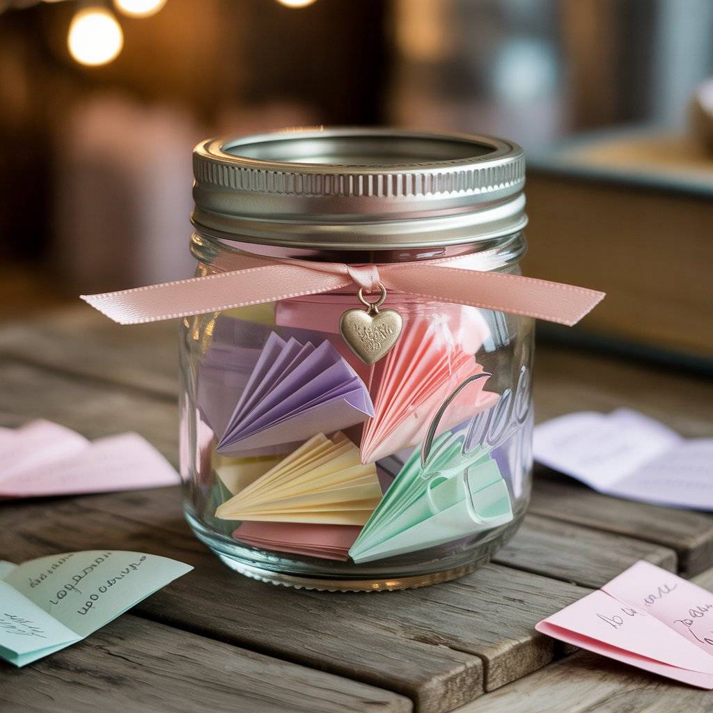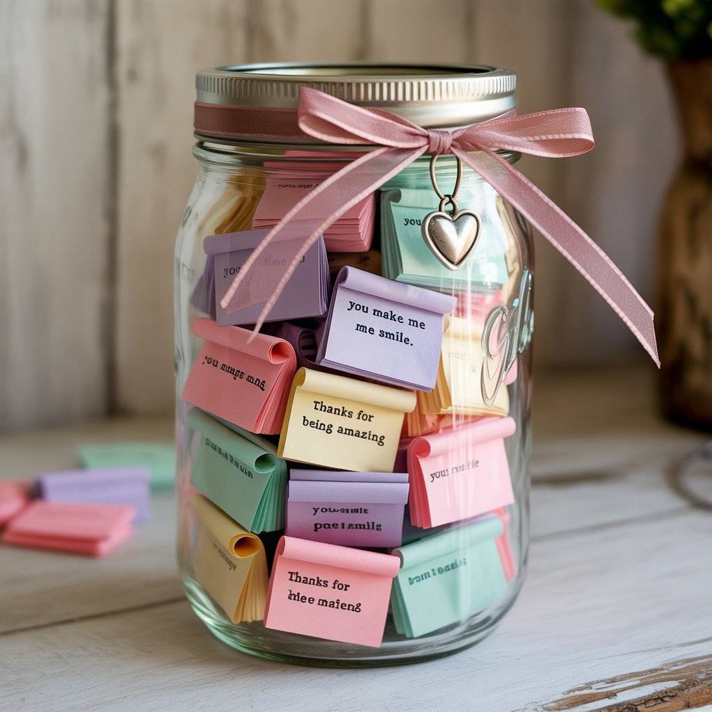 The jar becomes a keepsake. People love opening one note whenever they need a pick-me-up. I decorate the lid with a ribbon or small charm to make it feel complete.