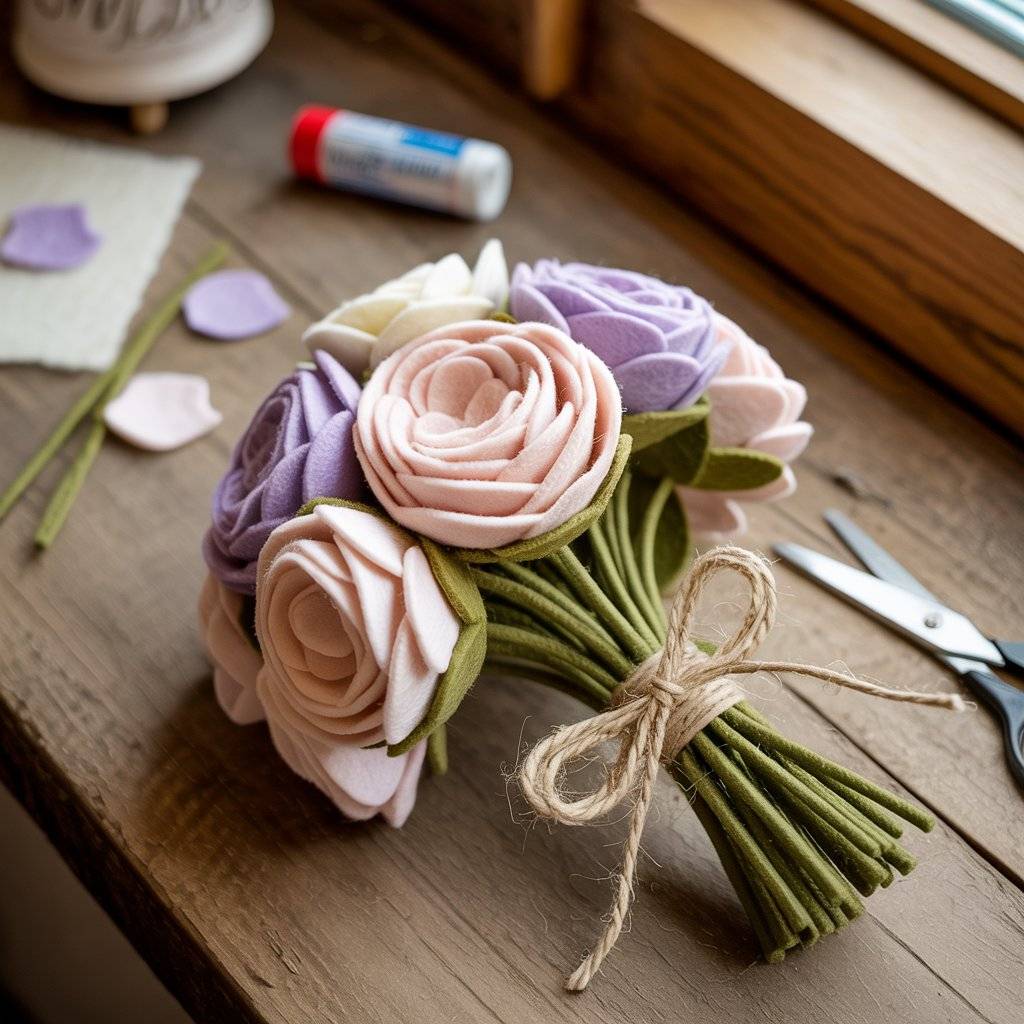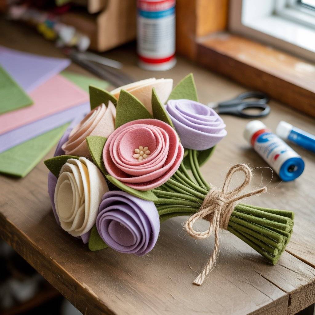 I once made small felt flower bouquets instead of real flowers. Using felt, scissors, and simple glue, I cut out petals and layered them to create blooms. I added a small stem with wire or pipe cleaners, then bundled them into a mini bouquet.