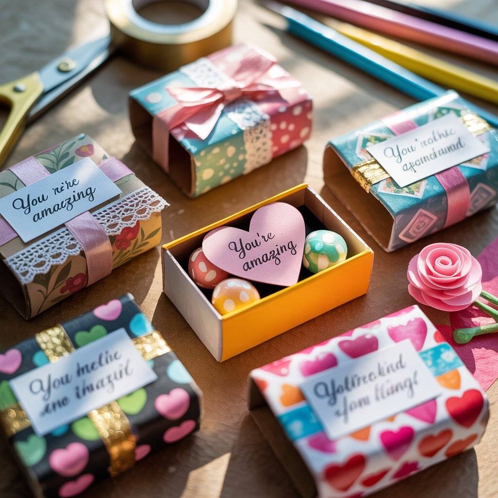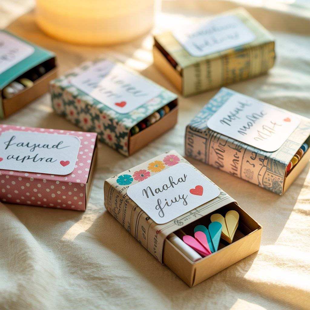 One cute idea I tried was decorating small matchboxes and turning them into tiny gift holders. I wrapped the outside with paper and added a label or drawing. Inside, I placed something small—notes, candy, or folded hearts with messages.