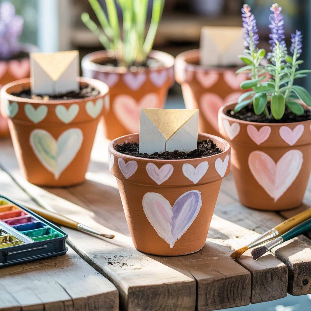 Painting small flower pots is another cute and practical Valentine’s craft. I start with plain clay pots and paint them in soft colors nothing too bold. Sometimes I add a small heart or a simple word. Inside the pot, I place a folded note before adding soil and a plant.