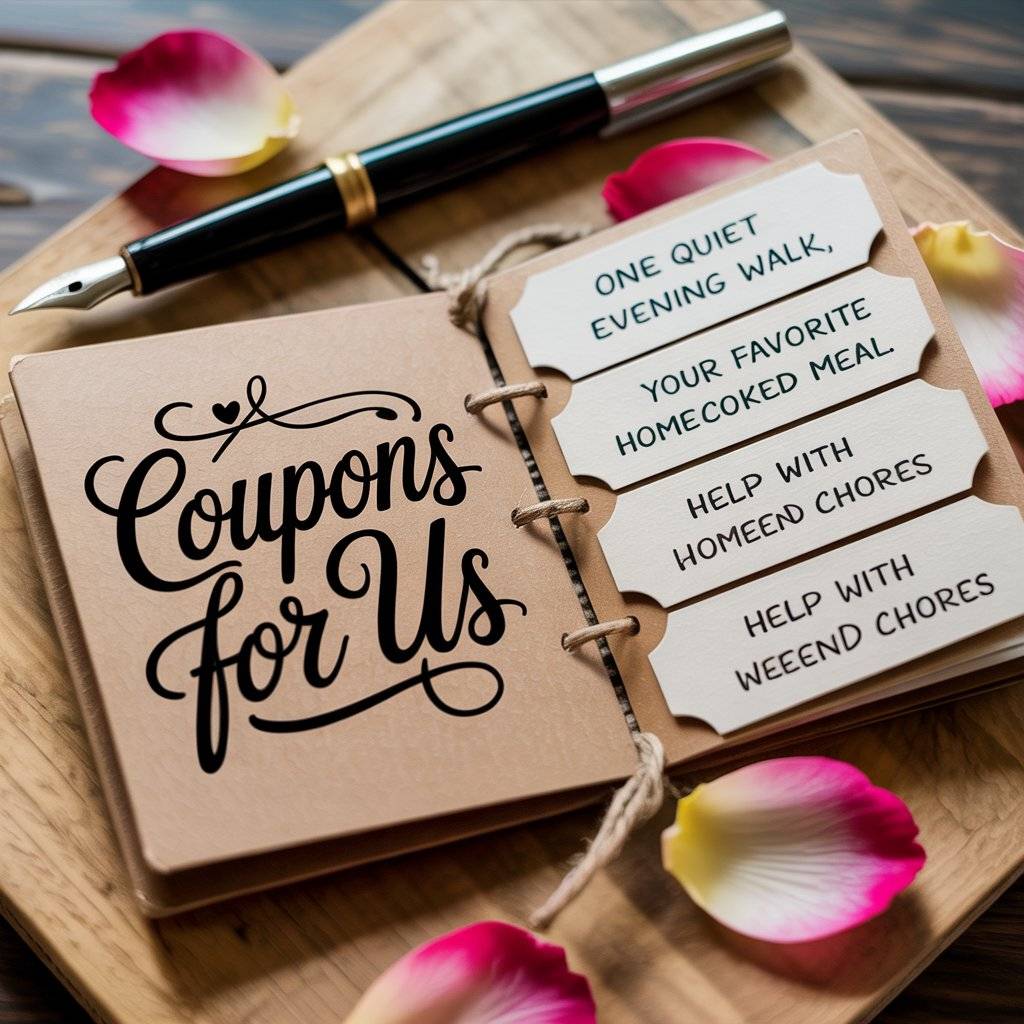 A coupon book is one of the most flexible Valentine’s crafts I’ve made. I cut small rectangles of paper, stapled them together, and wrote simple offers inside things like a quiet walk, a home-cooked meal, or help with a task they usually handle alone.