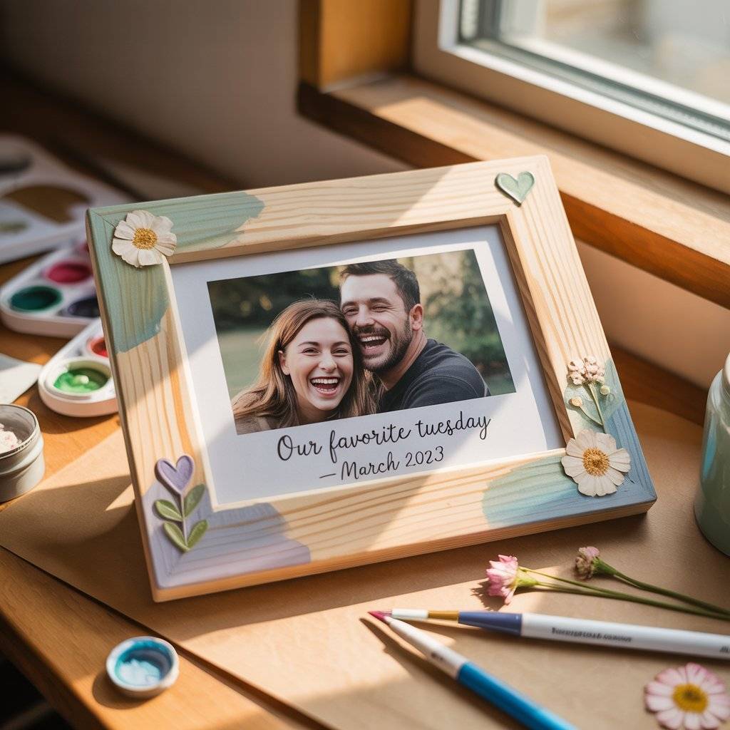 I’ve made personalized photo frames many times, and they always feel special. I start with a plain wooden frame and decorate it lightly using paint, markers, or pressed paper shapes. I avoid heavy decorations and keep the focus on the photo itself.