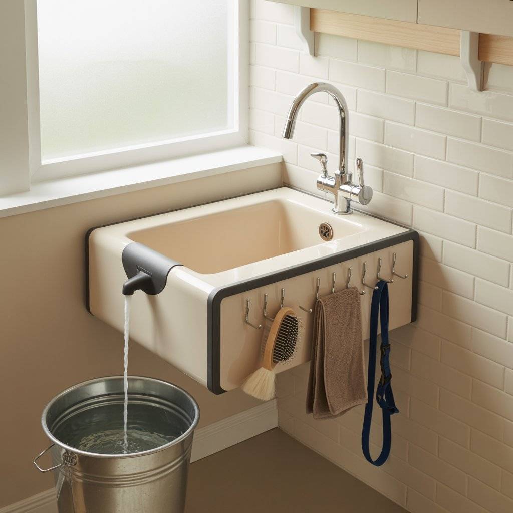 If you’ve got a backyard with a water supply nearby, converting an outdoor utility sink into a dog grooming station is really practical. When I set mine up, I added a long-reach spray nozzle and a flexible hose so I could rinse my dog without lifting them too much. The sink sits on a sturdy stand, and a small rubber mat prevents slipping.