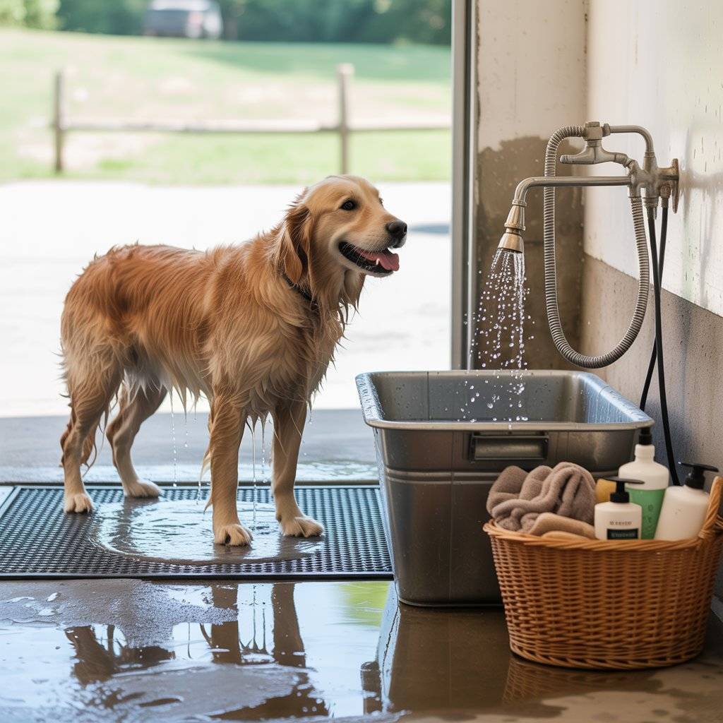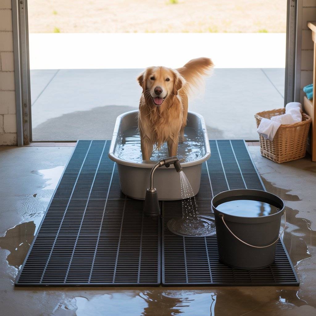 A stall mat from a farm supply store became the base of one of my most effective stations. I placed the thick rubber mat in my garage, set a shallow plastic tub on top, and attached a hand sprayer to a nearby faucet. The mat absorbs noise and helps keep my dog from slipping, and the edges of the tub keep water from running everywhere.