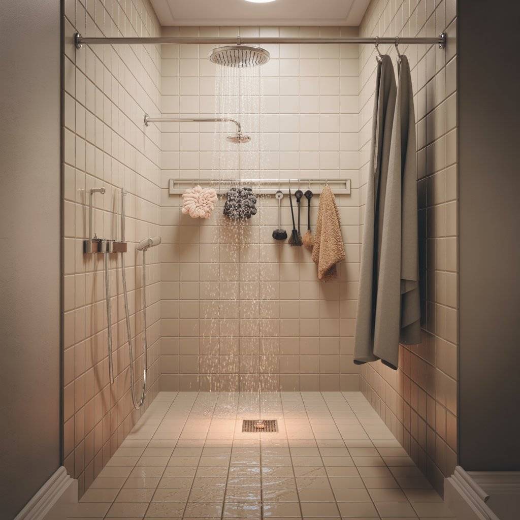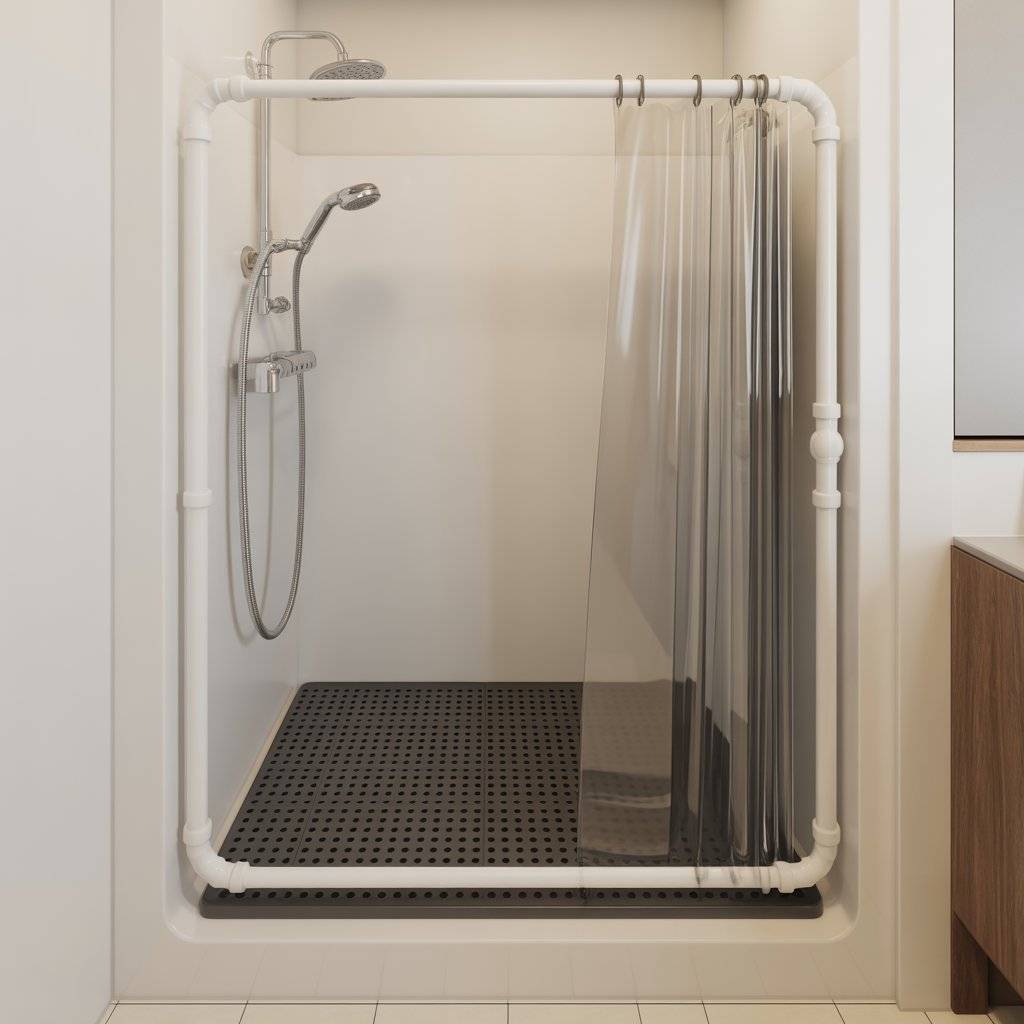 Inside, I keep a non-slip mat and a handheld sprayer on a long hose. My dog feels secure because their paws don’t slip, and the curtain keeps water from splashing outside the shower. After bathing, I rinse the curtain and mat, then let them air dry.