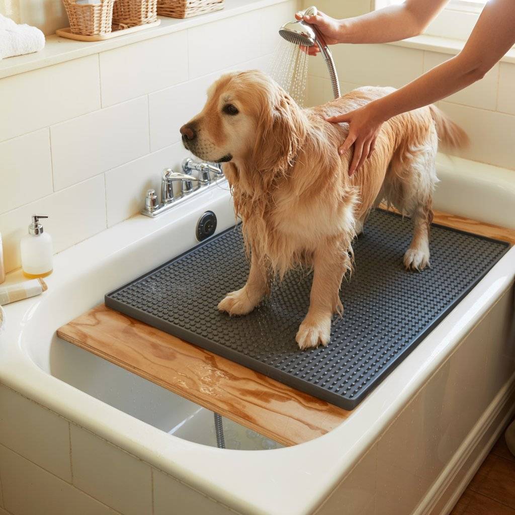 For homes with a standard tub, a slide-in board with a non-slip pad can turn bath time into a calmer experience. What I did was place a sturdy board across the tub’s edges and covered it with a rubber, textured mat. My dog stands on the board instead of the slippery tub bottom, which makes them more relaxed and steady.