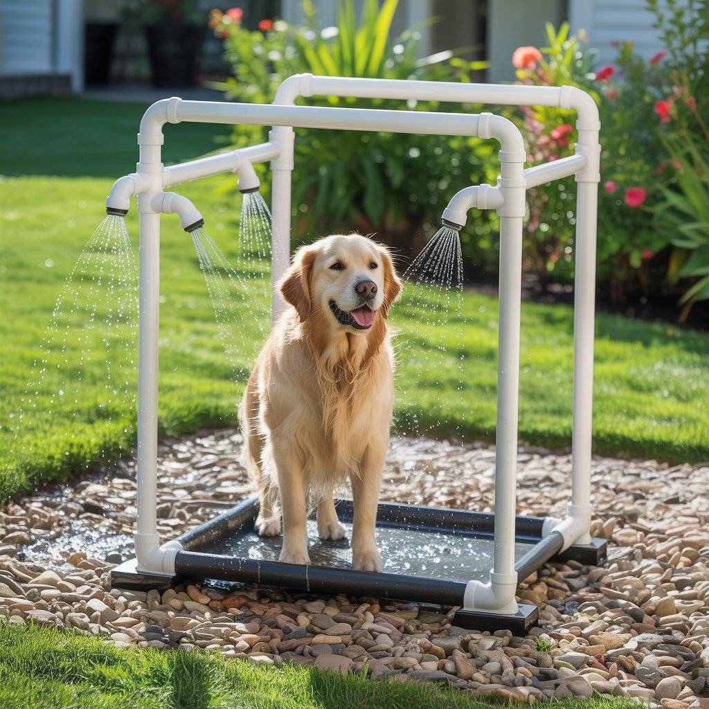 The last idea I’ll share is a DIY PVC spray cage a frame built from PVC pipe with spray nozzles placed around it. I built mine in the backyard, attaching the nozzles to a garden hose so water comes from all sides. Inside, I place a rubber mat so my dog stands on something comfortable and won’t slip.