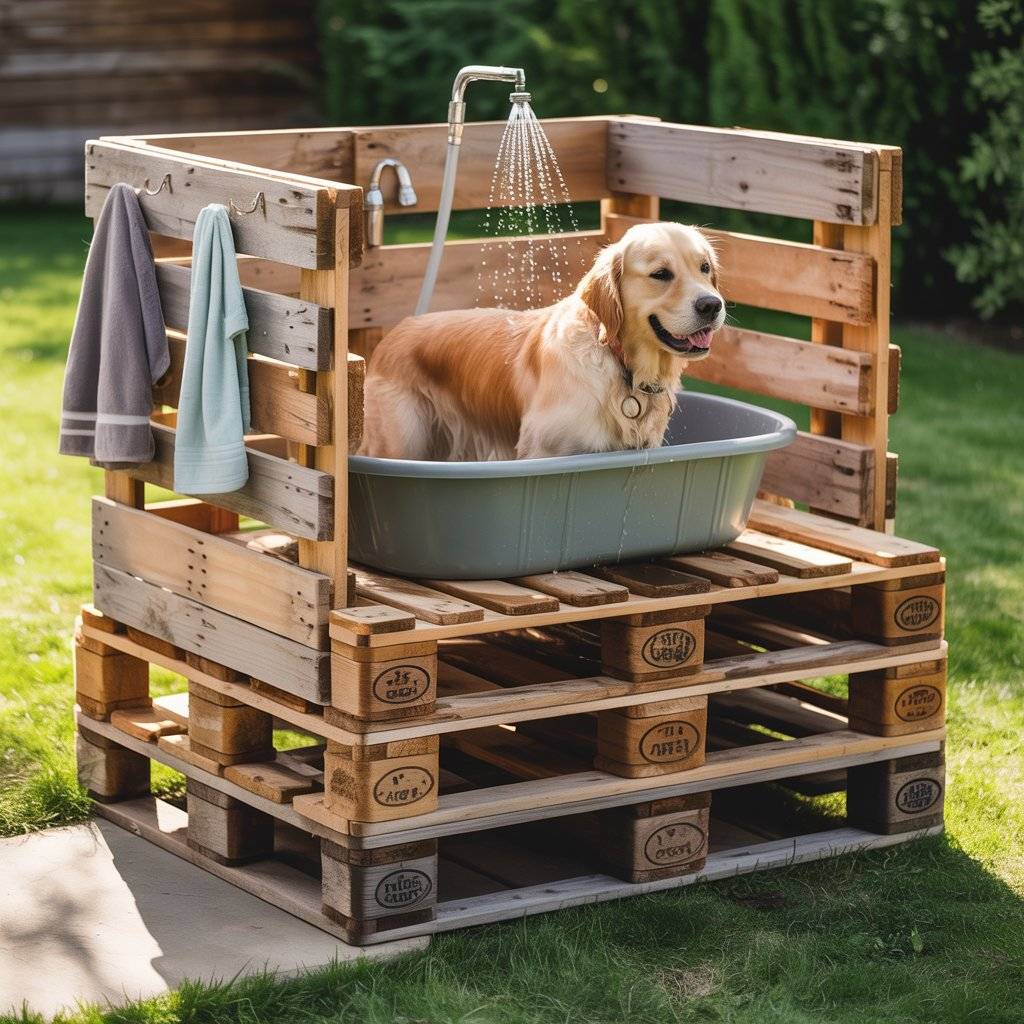 What makes this setup great for a backyard is how it manages water flow and dog movement. The pallets give your dog something solid to stand on, and the gaps let water drain down without pooling. I also attached a simple garden hose spray nozzle to keep water pressure gentle but effective. After bathing, it’s easy to rinse off the station and let it air dry.