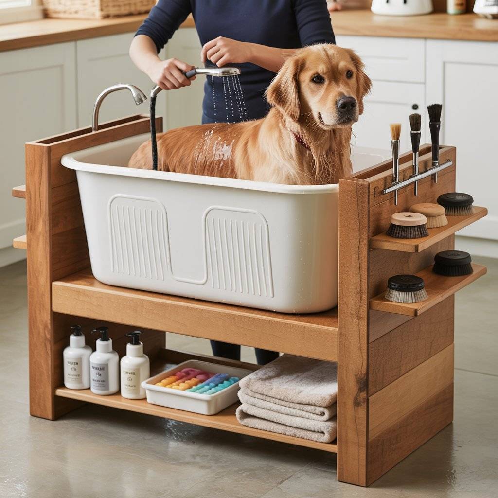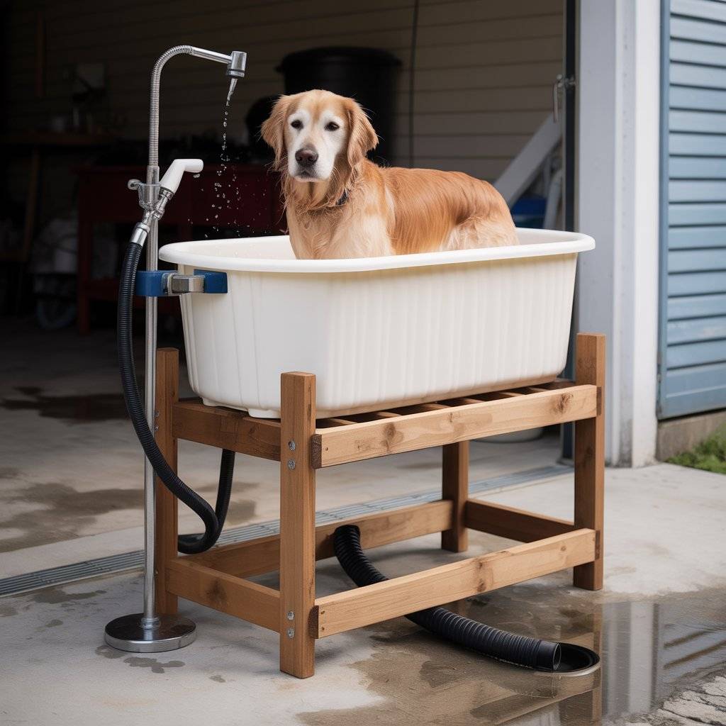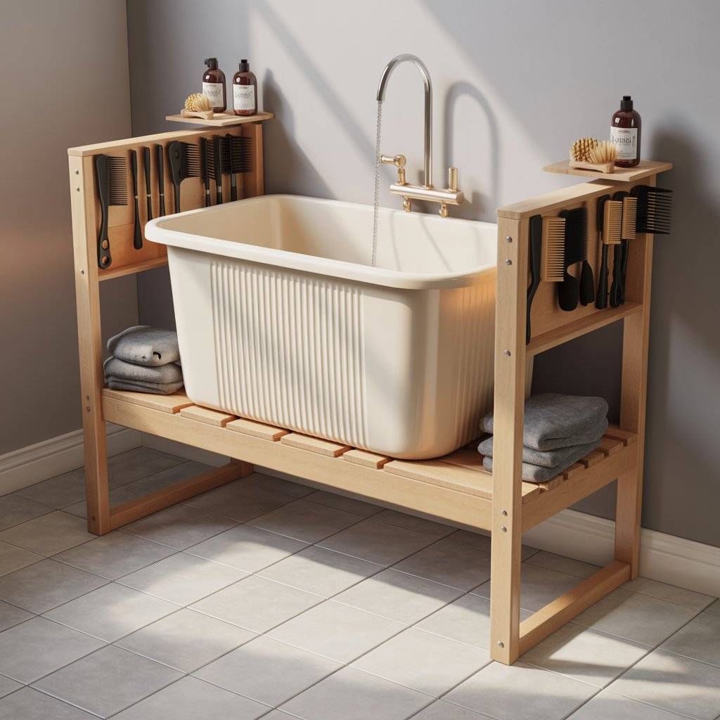 An elevated grooming tub is one of the simplest ways to avoid bending over and splashing water all over the floor. I built mine using a sturdy plastic tub set on a raised platform made of treated lumber. The height keeps my back from hurting, and it gives water a natural path down a drain hose connected at the bottom.