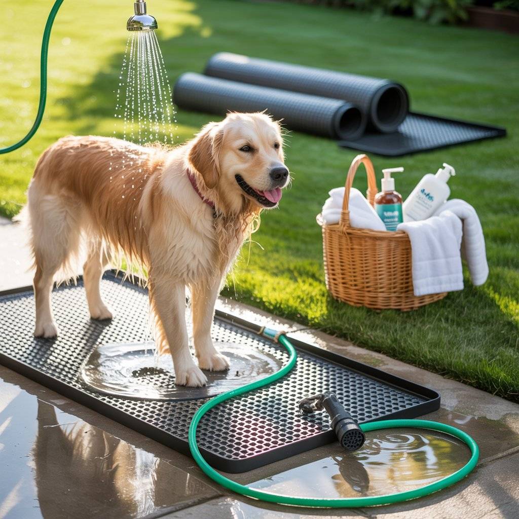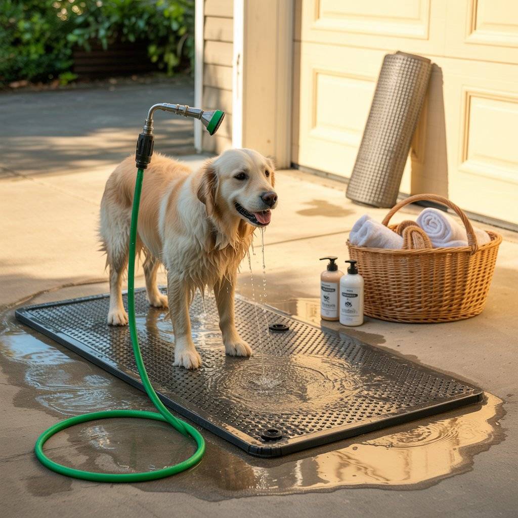 A portable shower mat with a hose attachment is one of the easiest, most mess-free ways to bathe a dog at home. I use a textured rubber mat that lays flat on the ground and connects to my garden hose with a spray nozzle. My dog stands comfortably on the mat, and the water drains right through it instead of pooling on the floor.