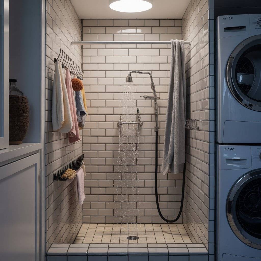 A simple shower curtain on a rod keeps the water from splashing out, and I keep hooks nearby for towels, treats, and grooming brushes. Because the station is indoors, I can bathe my dog year-round, rain or shine.