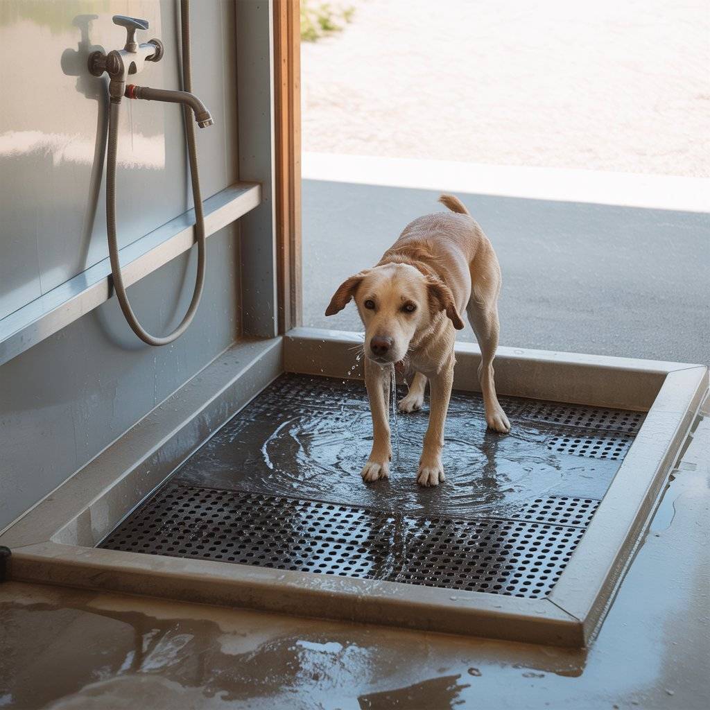 It doesn’t need to be complicated just use materials that handle water well and are easy to hose down. This small setup helps keep mud from spreading and makes the space easier to manage day to day.