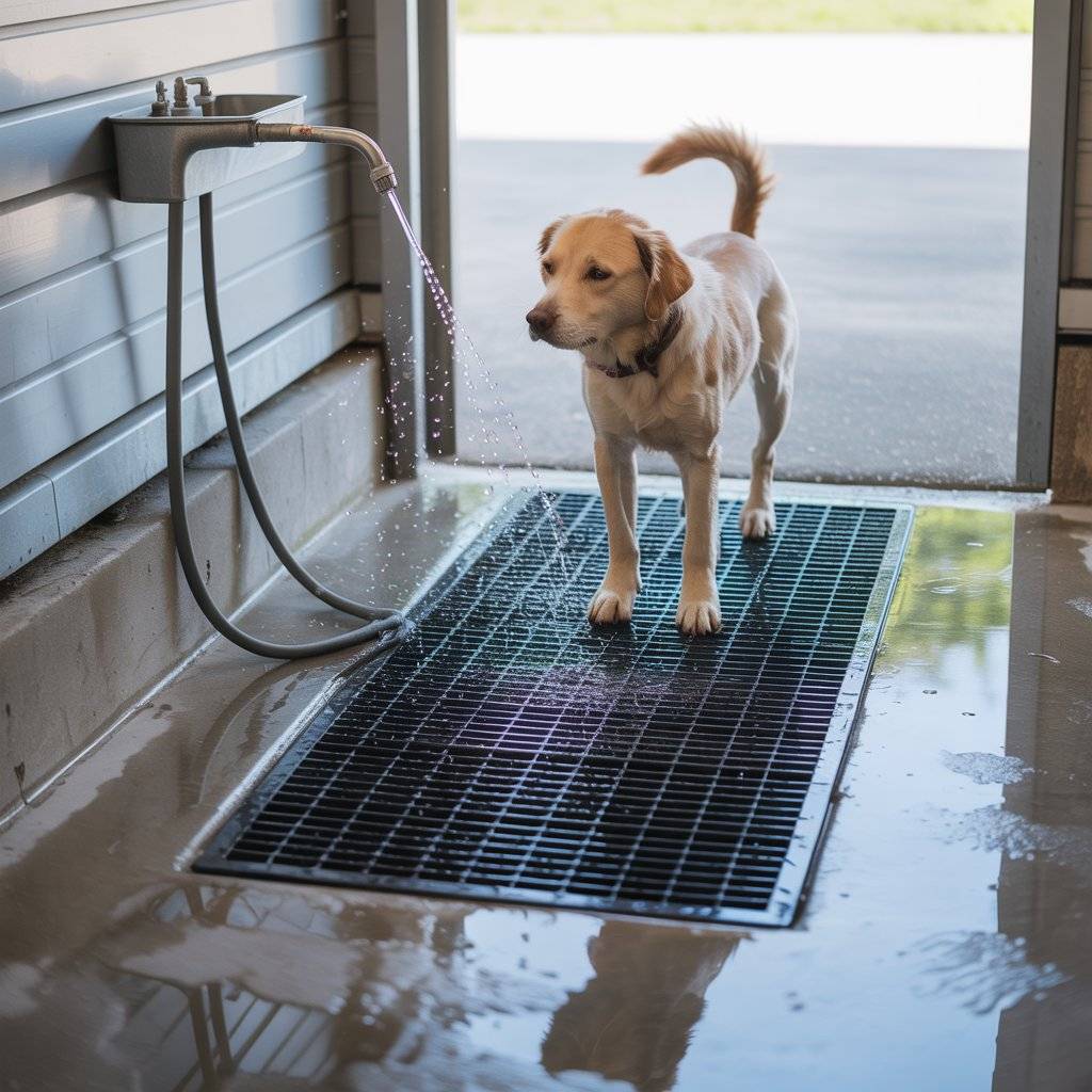 If your dog tends to come in muddy, setting up a small wash spot near the pen entrance can save you a lot of cleanup. A washable drain mat gives them a place to stand while you rinse off dirty paws before they move through the garage.
