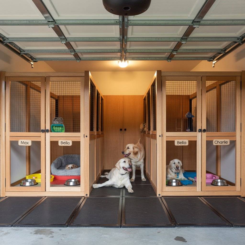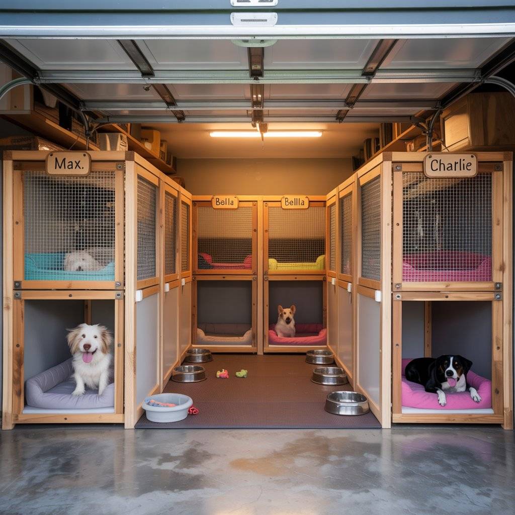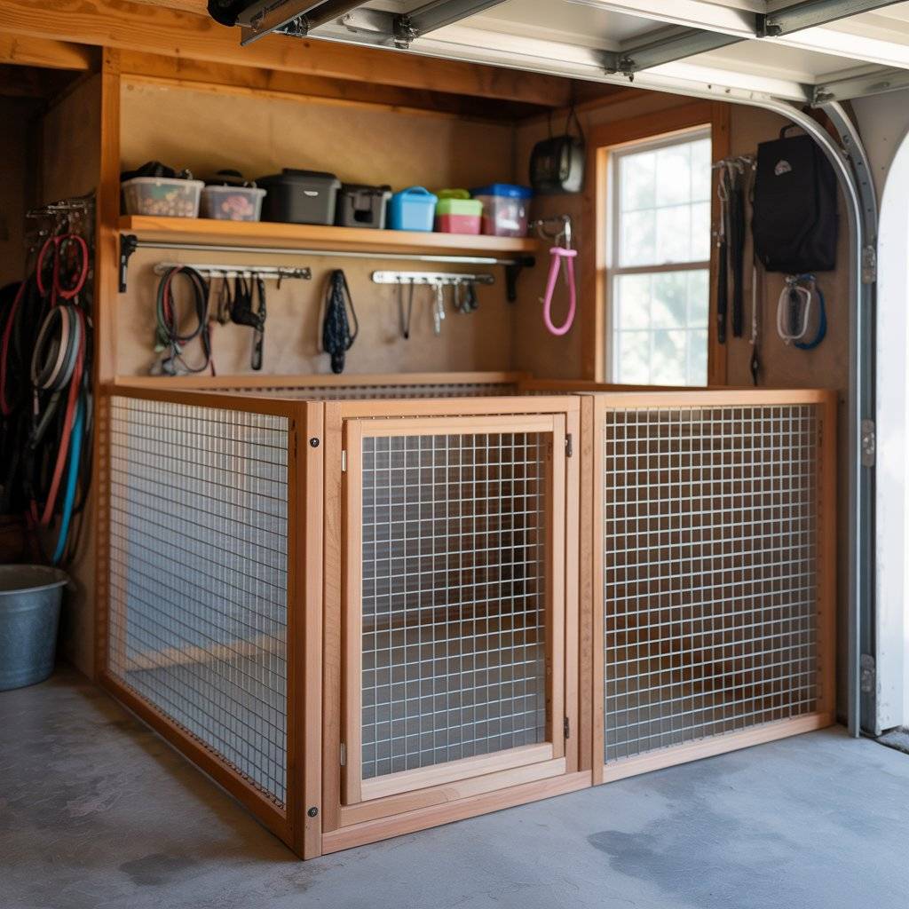 When you want something that feels more permanent, you can build a kennel directly into part of your garage using wood or metal framing and mesh panels. This creates a tidy dog space that doesn’t block off the whole garage.