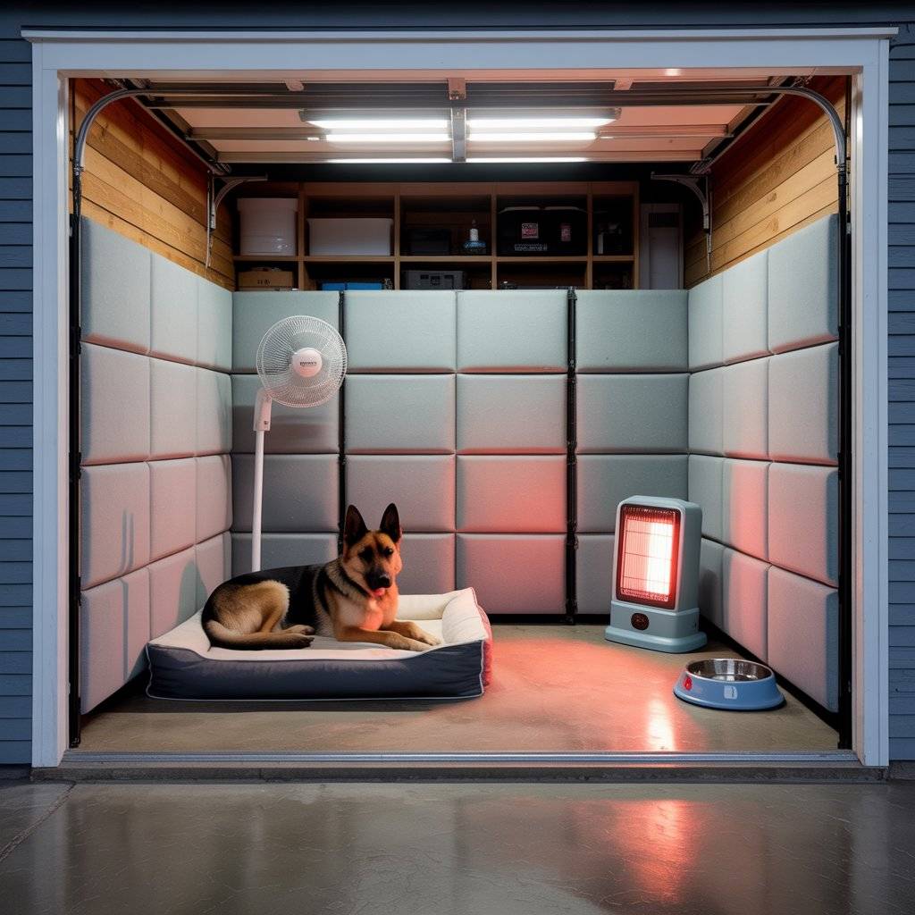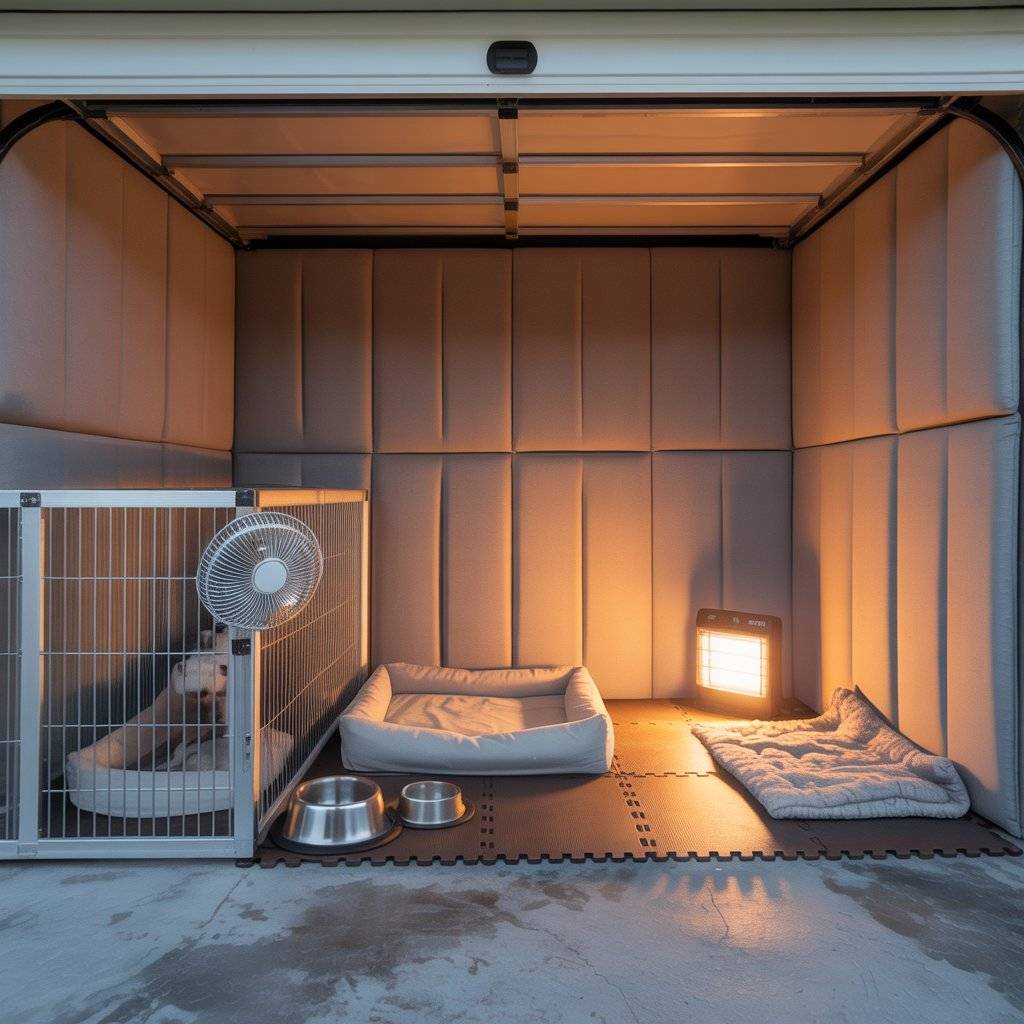 If your garage gets baking hot in summer or freezing cold in winter, consider a climate-controlled dog pen. Insulating the walls of the pen area with foam panels can make a big difference. For cooling, a small clip-on fan helps airflow, and for warmth in winter, a safe heating pad or dog-safe radiant heater goes a long way.
