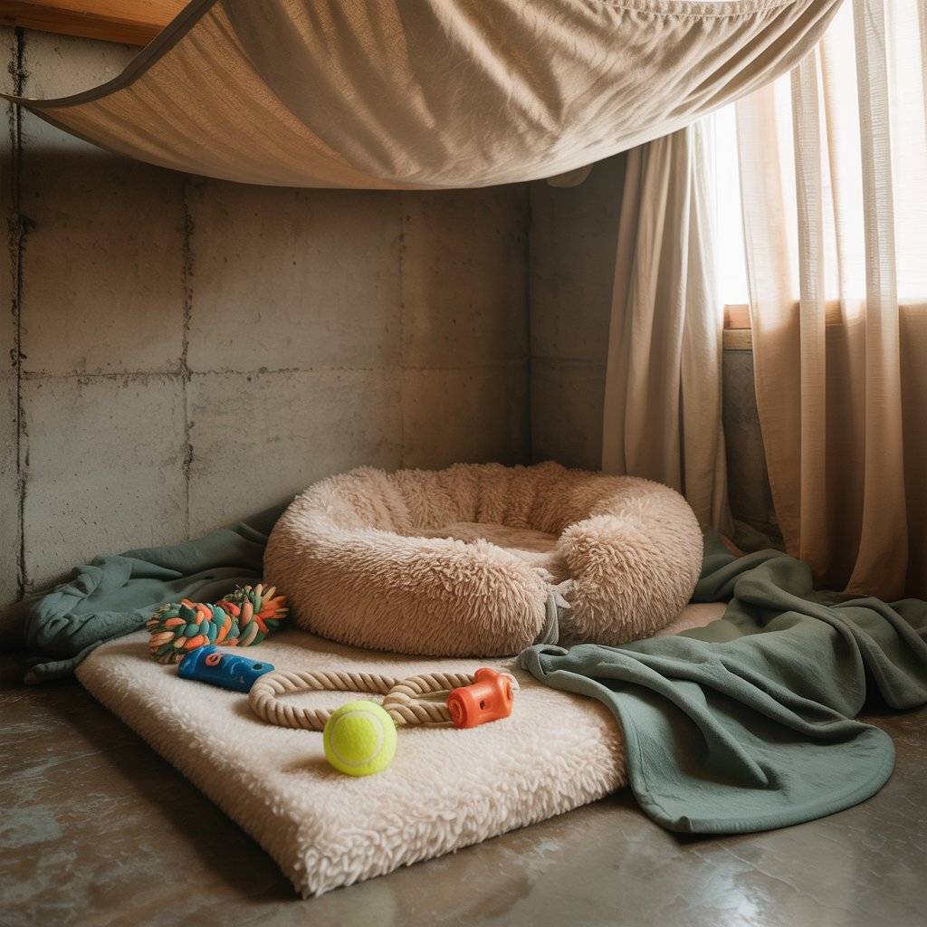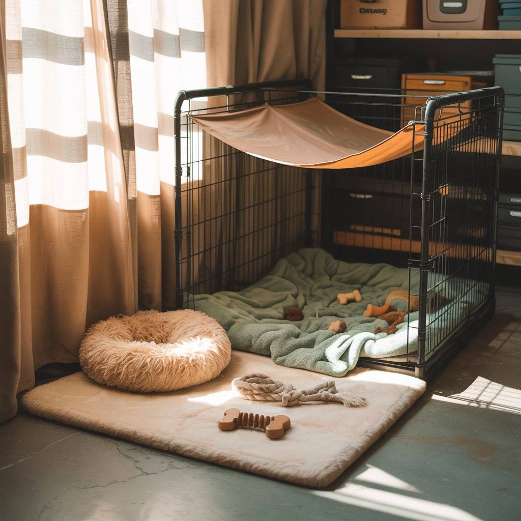 Sometimes the simplest pen is the coziest. Choose a quiet corner of your garage and set up a pen with soft blankets, a comfy bed, and your dog’s favorite toys. Adding a hooded bed or canopy over part of the pen gives a sense of security.