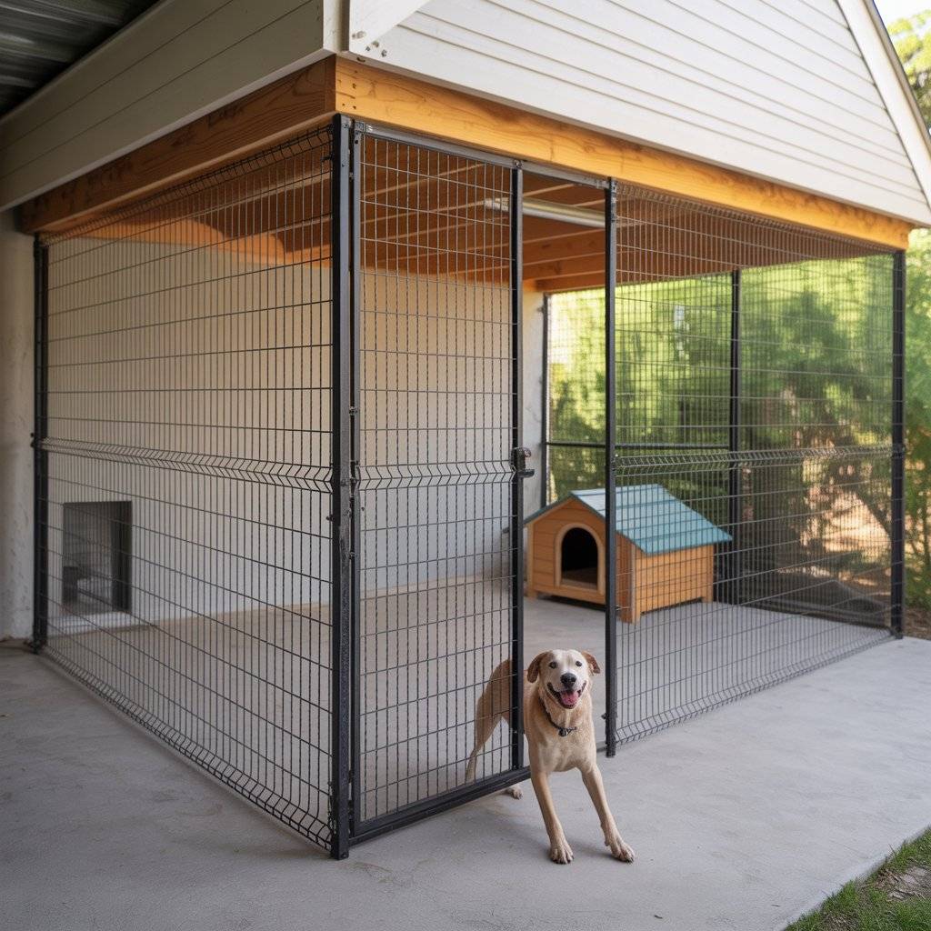 For active dogs that like more room to move, you can attach a dog run to your garage pen. Use strong wire panels or welded mesh to form a fenced-off extension of the pen where your dog can stretch, play, and sniff around.