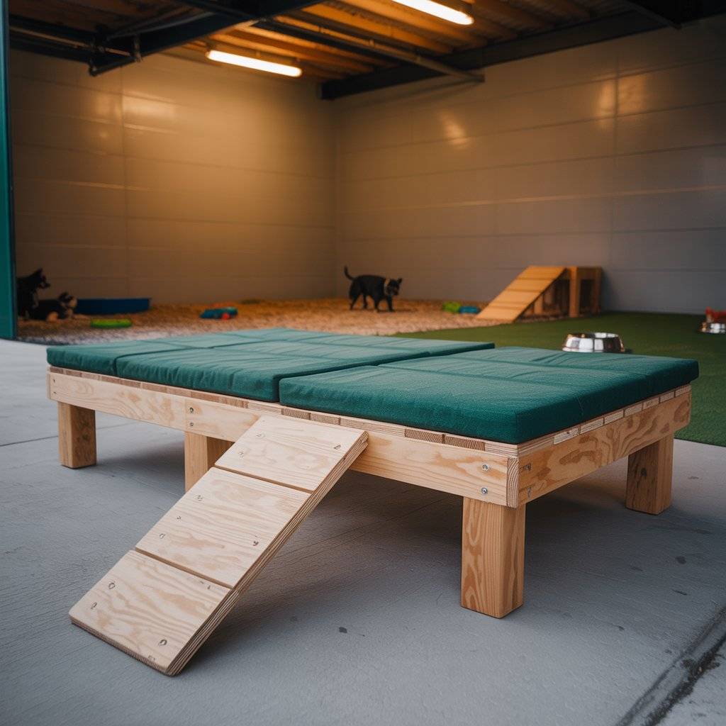 You can build a low platform with plywood and support legs, then cover it with a padded mat. This gives your dog a place to climb, rest, and survey the pen from a higher spot, which many dogs seem to enjoy.
