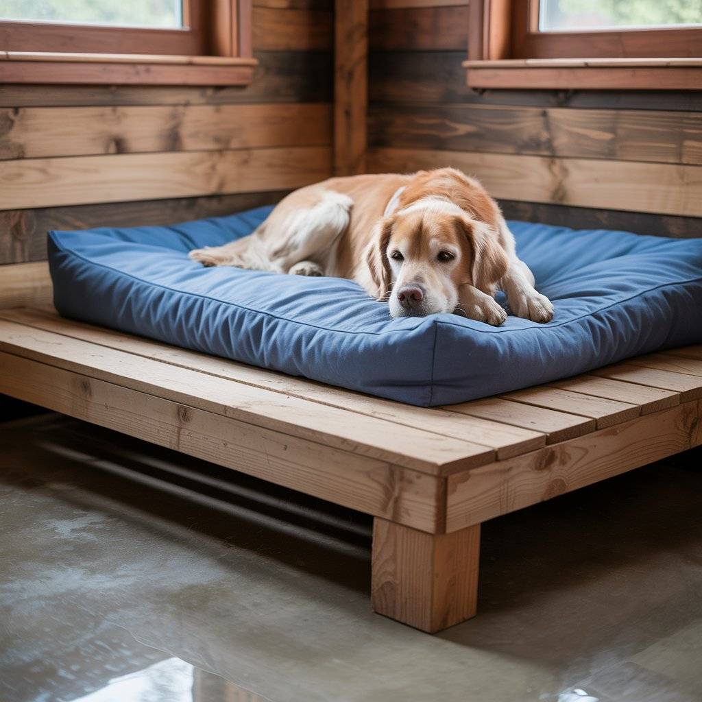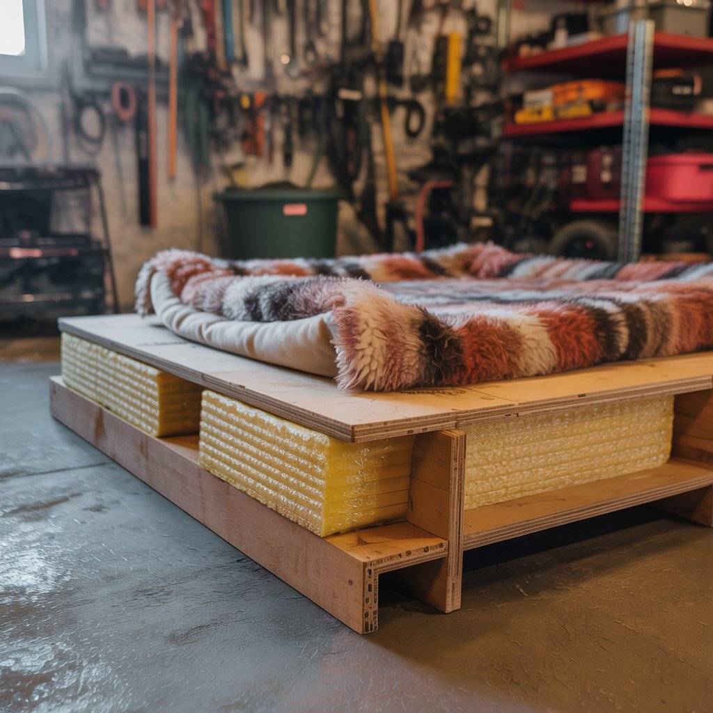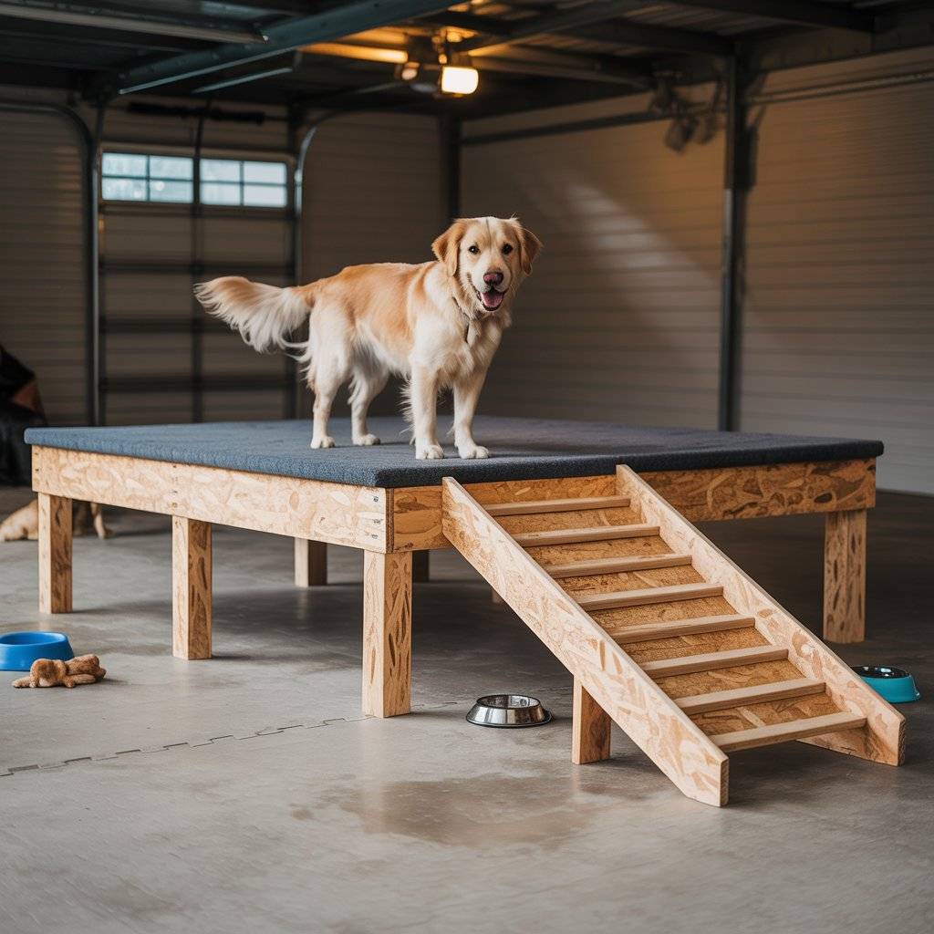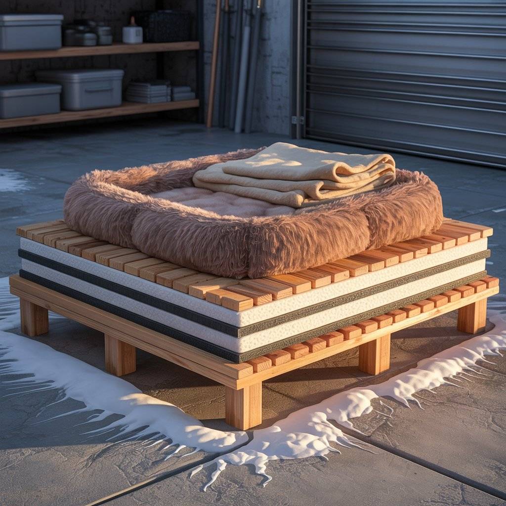 For garages that dip below freezing in winter, insulation matters. You can place rigid foam boards under your dog’s bedding or build a raised insulated platform with foam and wood.