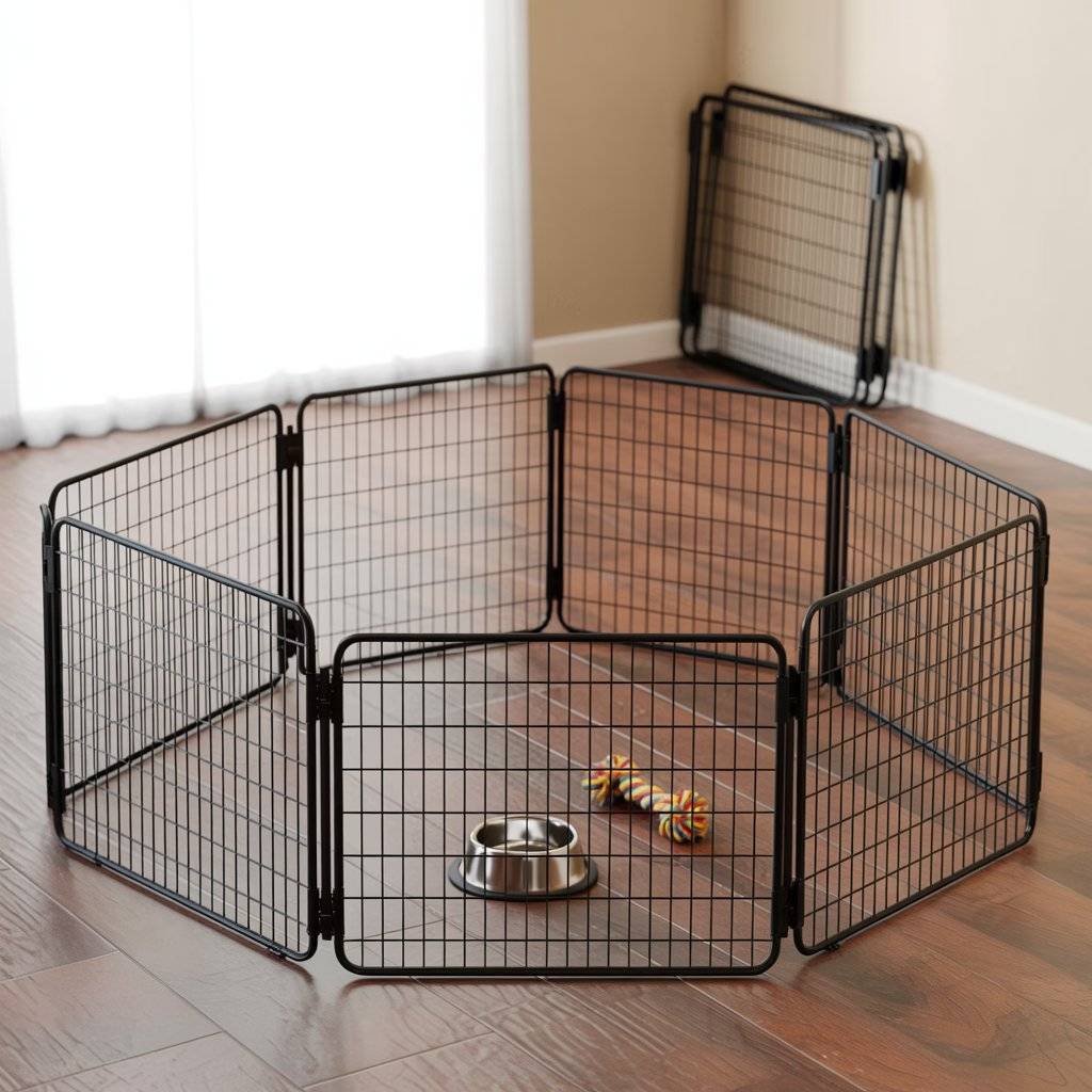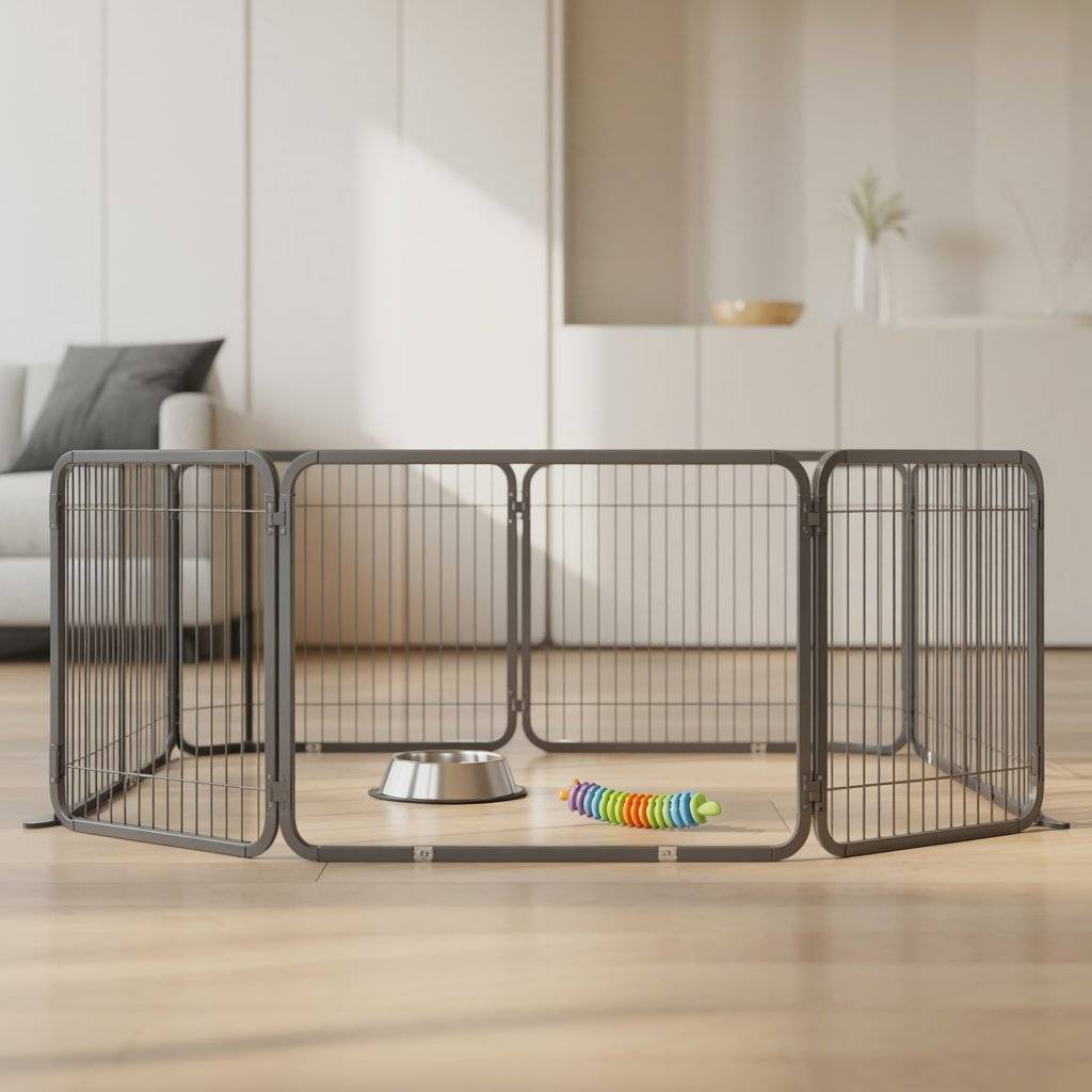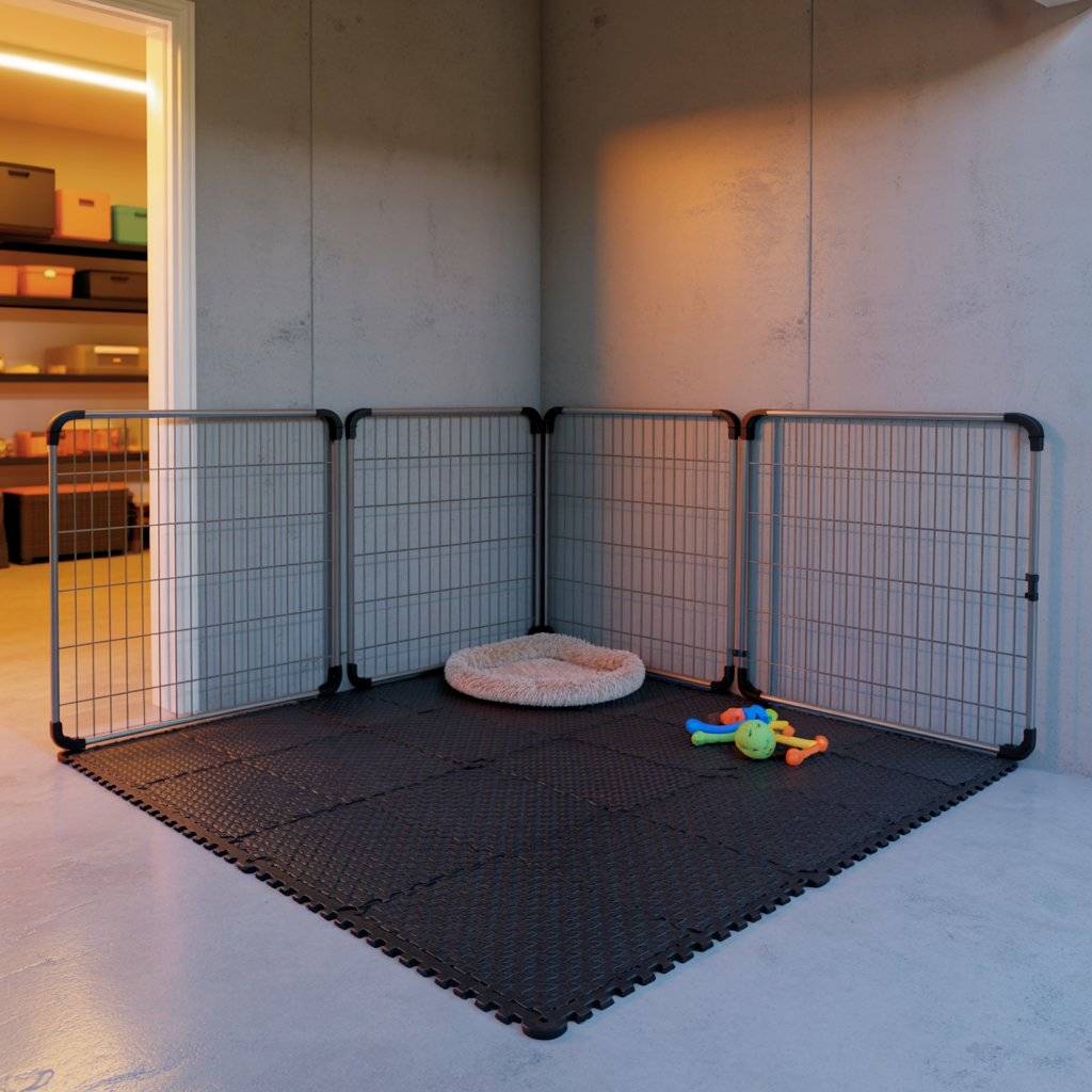 If you don’t want a permanent fixture, foldable exercise panels are a solid option. These panels clip together and can be arranged in different shapes square, rectangle, or even L-shaped depending on how much space you want to give your dog.