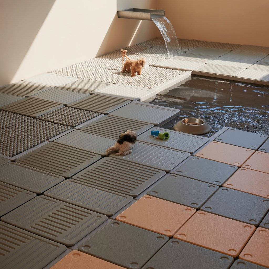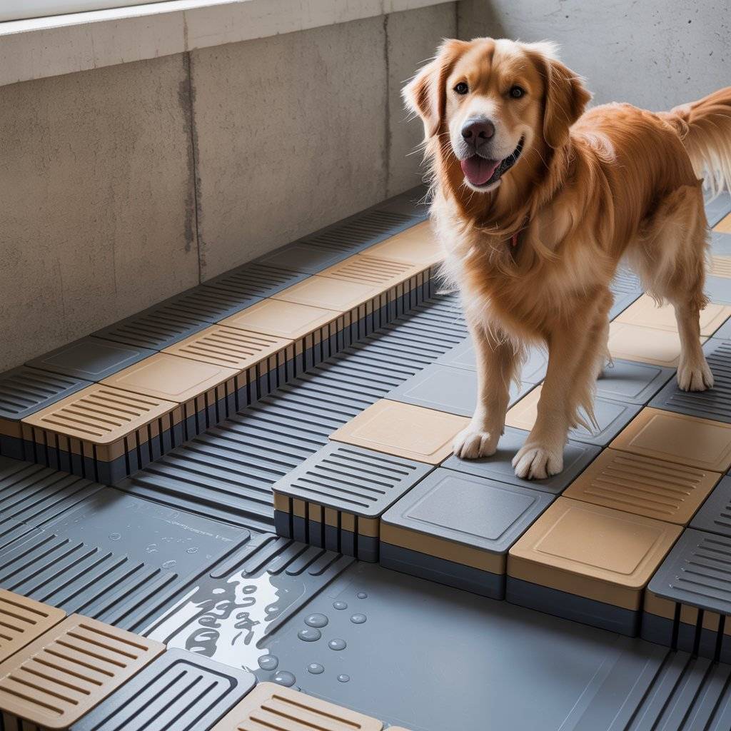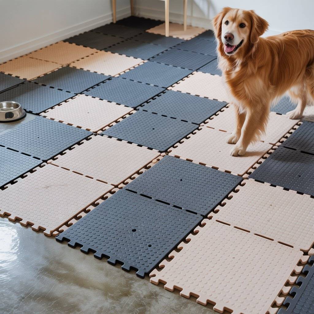 Concrete can be slippery or cold, so many dog owners lay down pet-safe flooring like rubber mats or interlocking foam tiles.