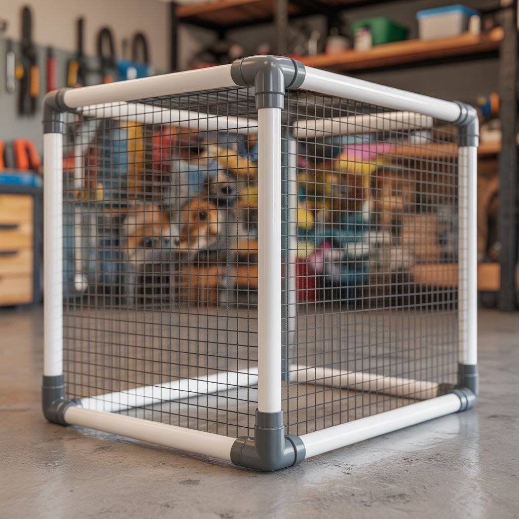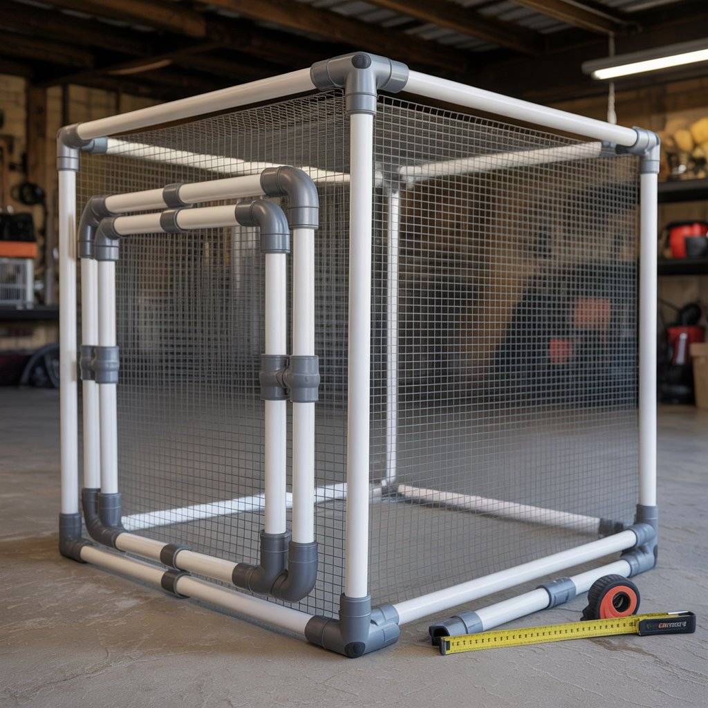 PVC pipe is cheap and easy to work with. You can build a simple frame using PVC connectors, then stretch mesh or wire over it to make a lightweight garage pen.