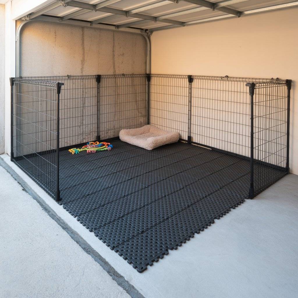 One of the easiest garage dog pens I’ve seen starts with choosing a corner of your garage that’s away from tools, chemicals, and vehicles. Use interlocking rubber mats on the floor they’re comfy for paws, easy to hose down, and warmer than bare concrete.