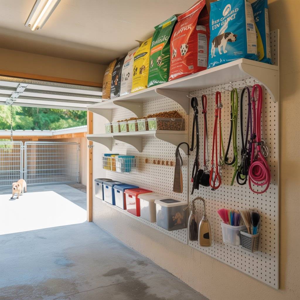 A great way to keep the garage pen organized is to build a small storage wall nearby for food, leashes, brushes, and cleaning supplies.