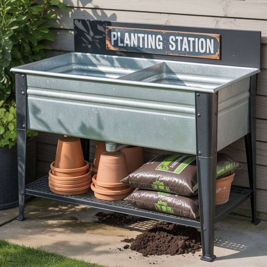 For durability and easy cleanup, go with a galvanized metal sink. Use a large tub-style basin on top of a weather-resistant frame. Keep one side open for potting and the other for rinsing tools or watering plants.