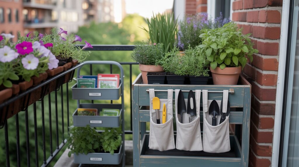 Store tools in hanging pouches, and keep soil in sealable bins. You can even use a vertical shelf with drawers for plant care items. Add a few railing planters nearby, and you’re set. It’s a compact idea with big impact.