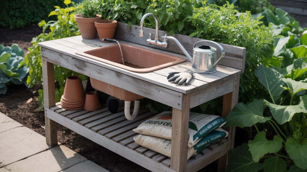 Include a flat surface beside the sink for potting work, plus a shelf underneath for storing soil or watering cans. Place it near your garden beds or greenhouse for quick access.