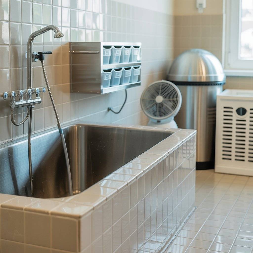 - Fast, quiet drying: Mount a quiet, low-heat pet dryer on a wall away from splash. Or add a secure clip point near the station for a portable dryer. Use flexible hose guides and cord hooks to keep the area tidy.