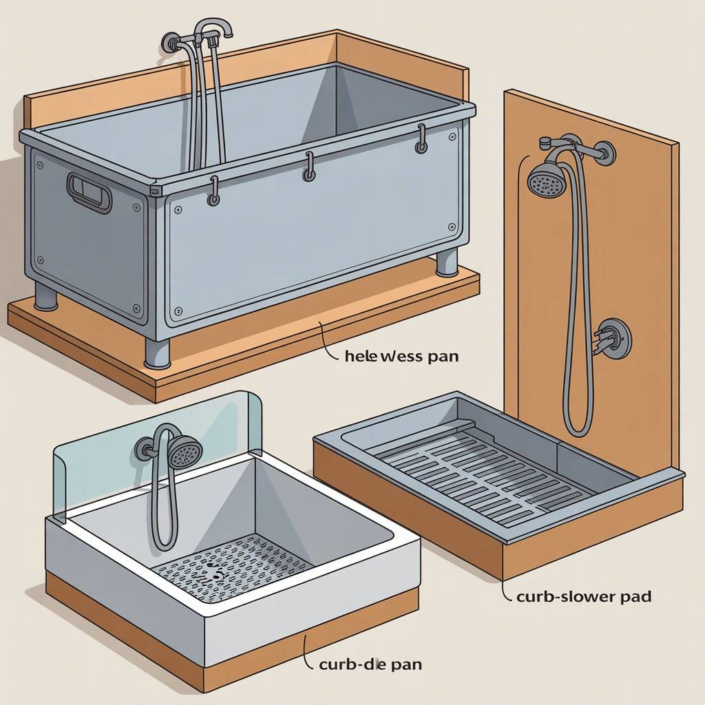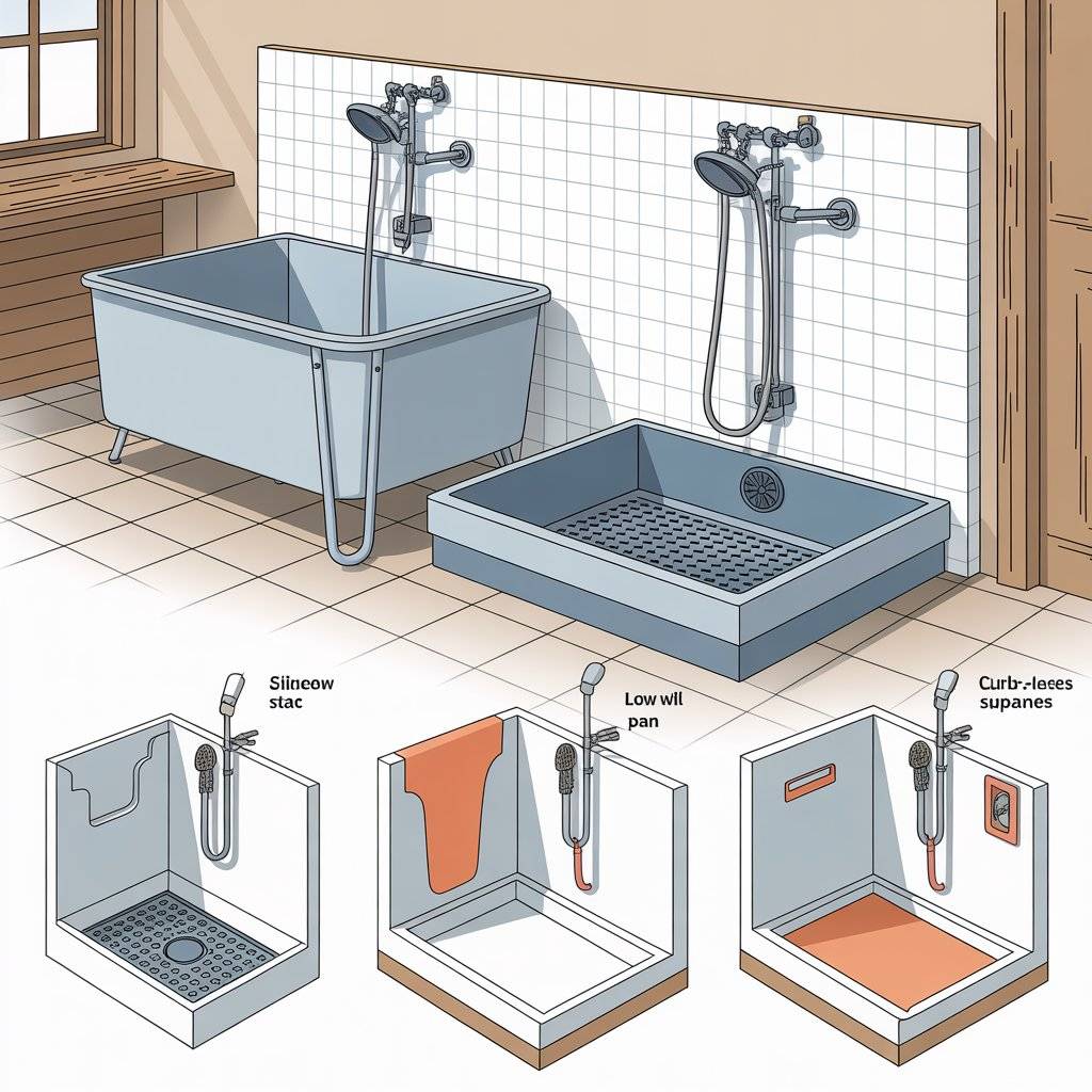 - Low shower pan: Easy step-in height, works with a wall sprayer. Choose a pan with a textured base.