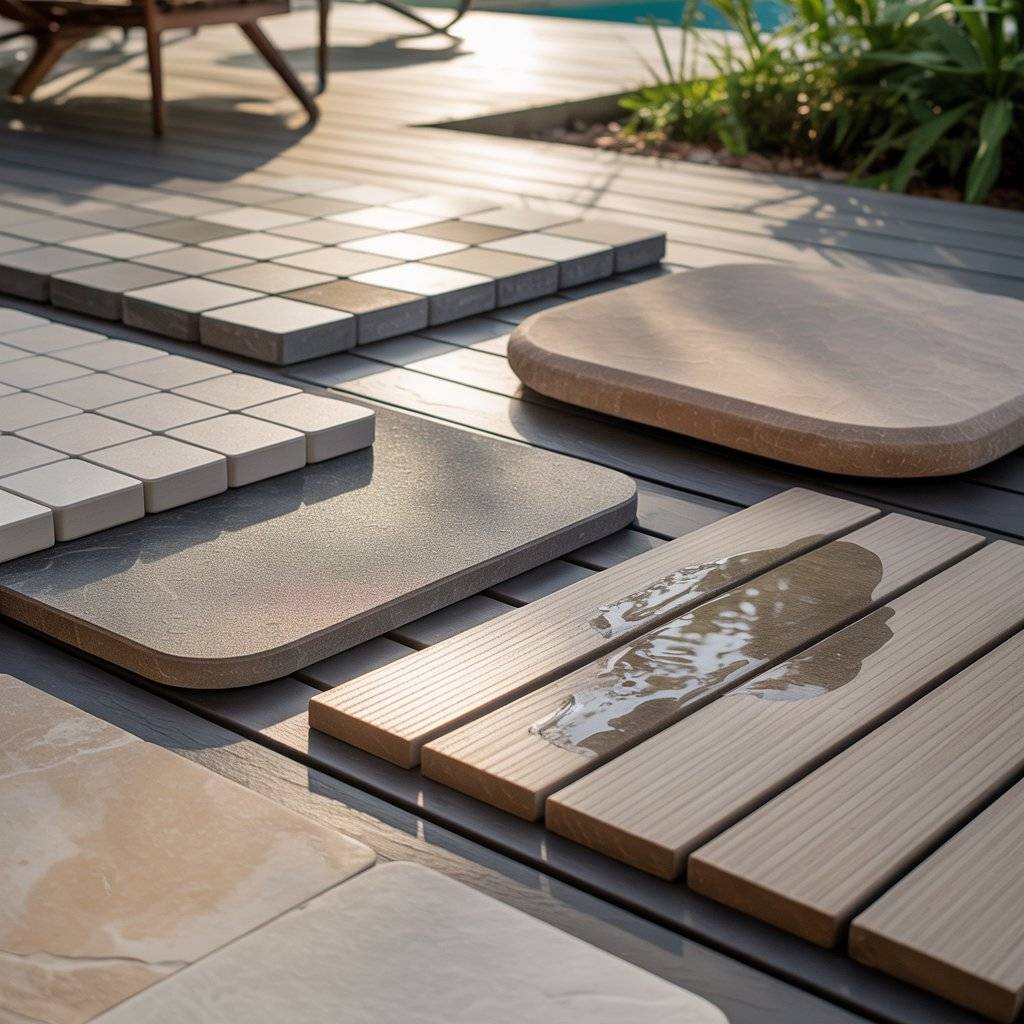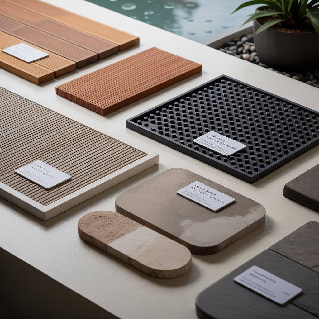 Choose materials that handle water, paws, and sun without fuss. Focus on traction, rounded edges, and easy cleaning.