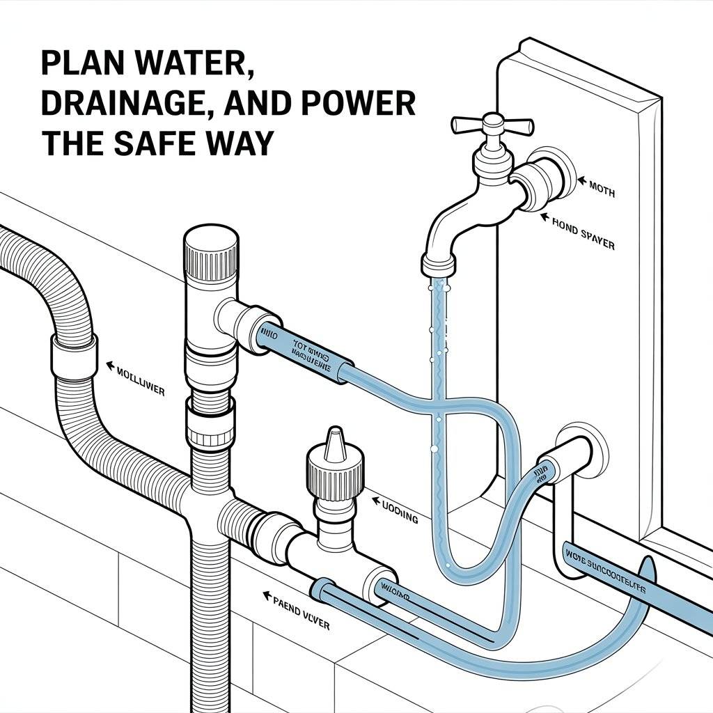 - Day 2: Run water lines, install mixing valve and sprayer, set tub or platform, add storage and hooks.