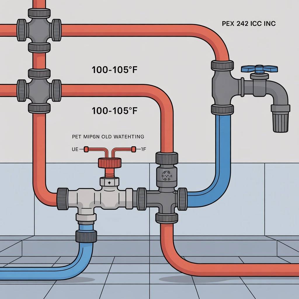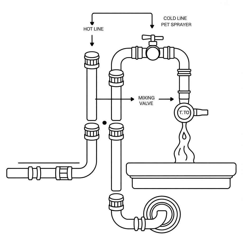 - Add a thermostatic mixing valve between hot and cold. Set max at 100 to 105°F for safe pet bathing.