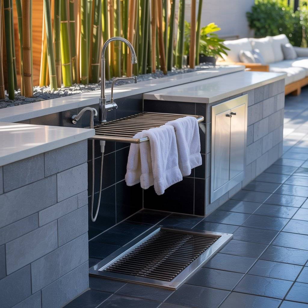 Place the wash near your outdoor kitchen or lounge for easy cleanups after grilling or pool time. Use the same stone counters, porcelain pavers, or stained concrete for visual cohesion. Hide plumbing in a low wall or island base, and keep towels and brushes in weatherproof drawers.