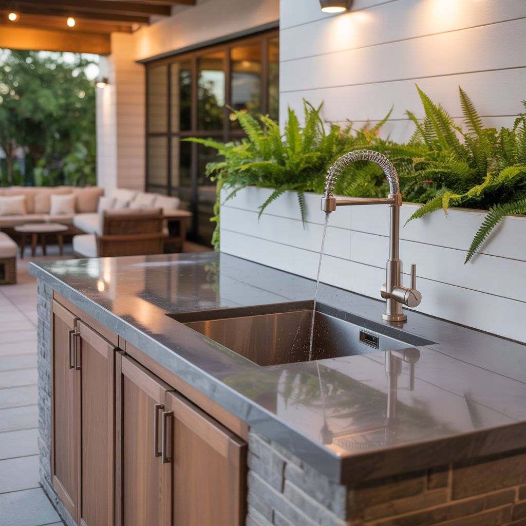 - Minimalist patios: Flat-front cabinetry, matte black fixtures, and linear drains.