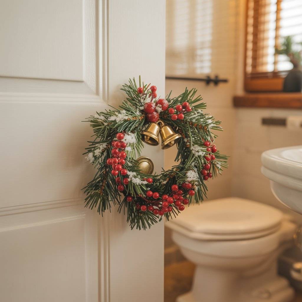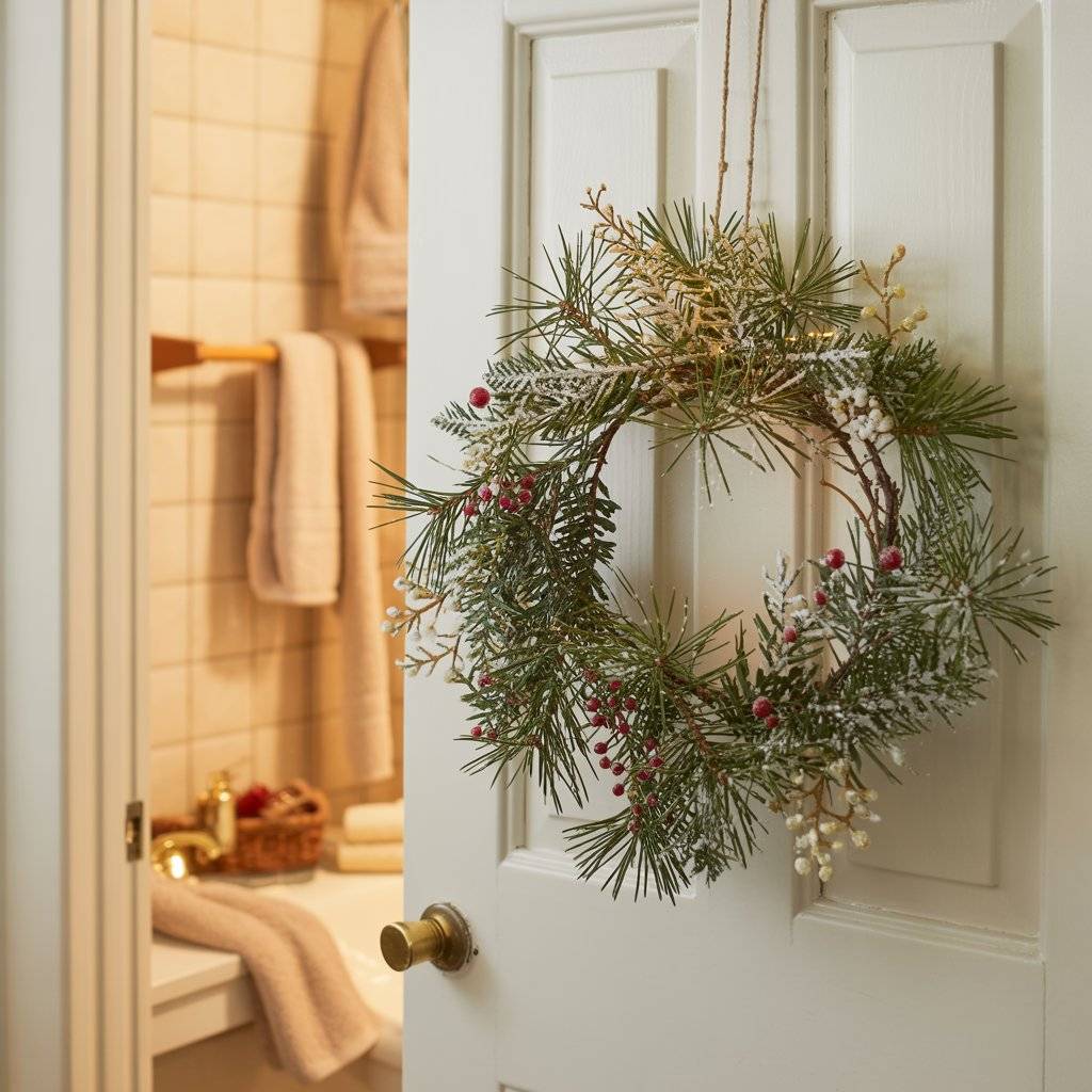10. Hang a Small Festive Wreath on the Bathroom Door