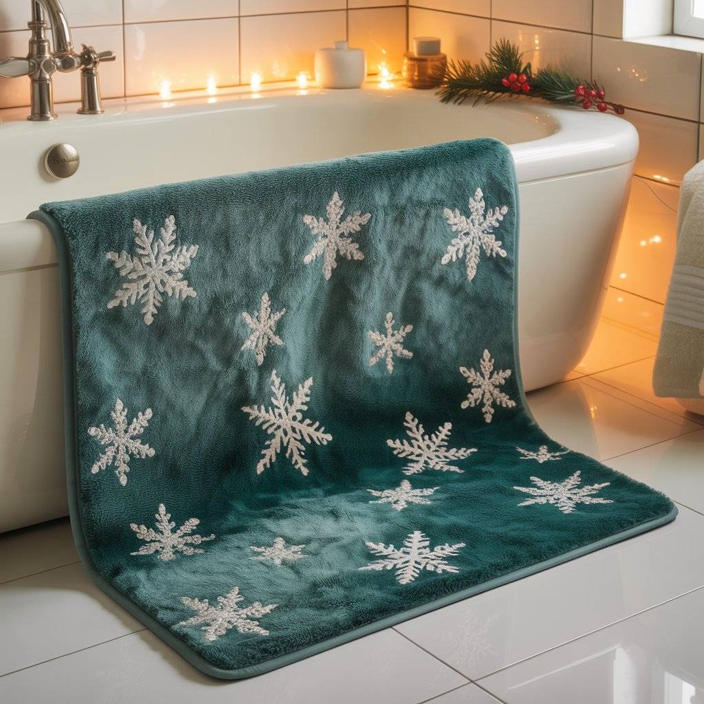 Check price on Amazon Snowflake Plush Bath Mat by CozyHearth soft, thick, machine washable, with subtle snowflake detail for holiday charm.