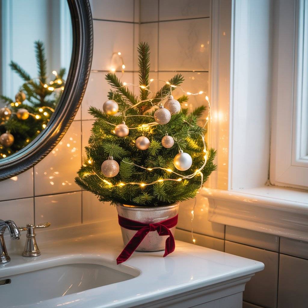 A tiny tabletop Christmas tree is perfect for bathrooms. Just a mini spruce or pine with a few tiny ornaments or fairy lights can feel magical.