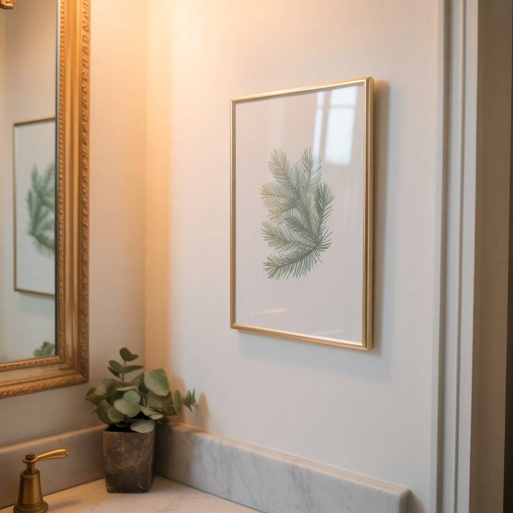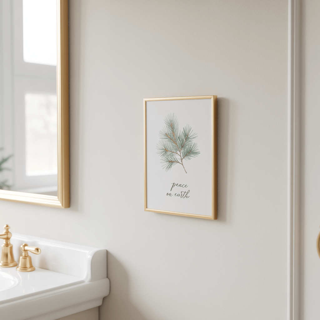 EverWinter Mini Christmas Printsmall 5×7 print with soft pine and gold highlights, perfect for a tiny bathroom wall.